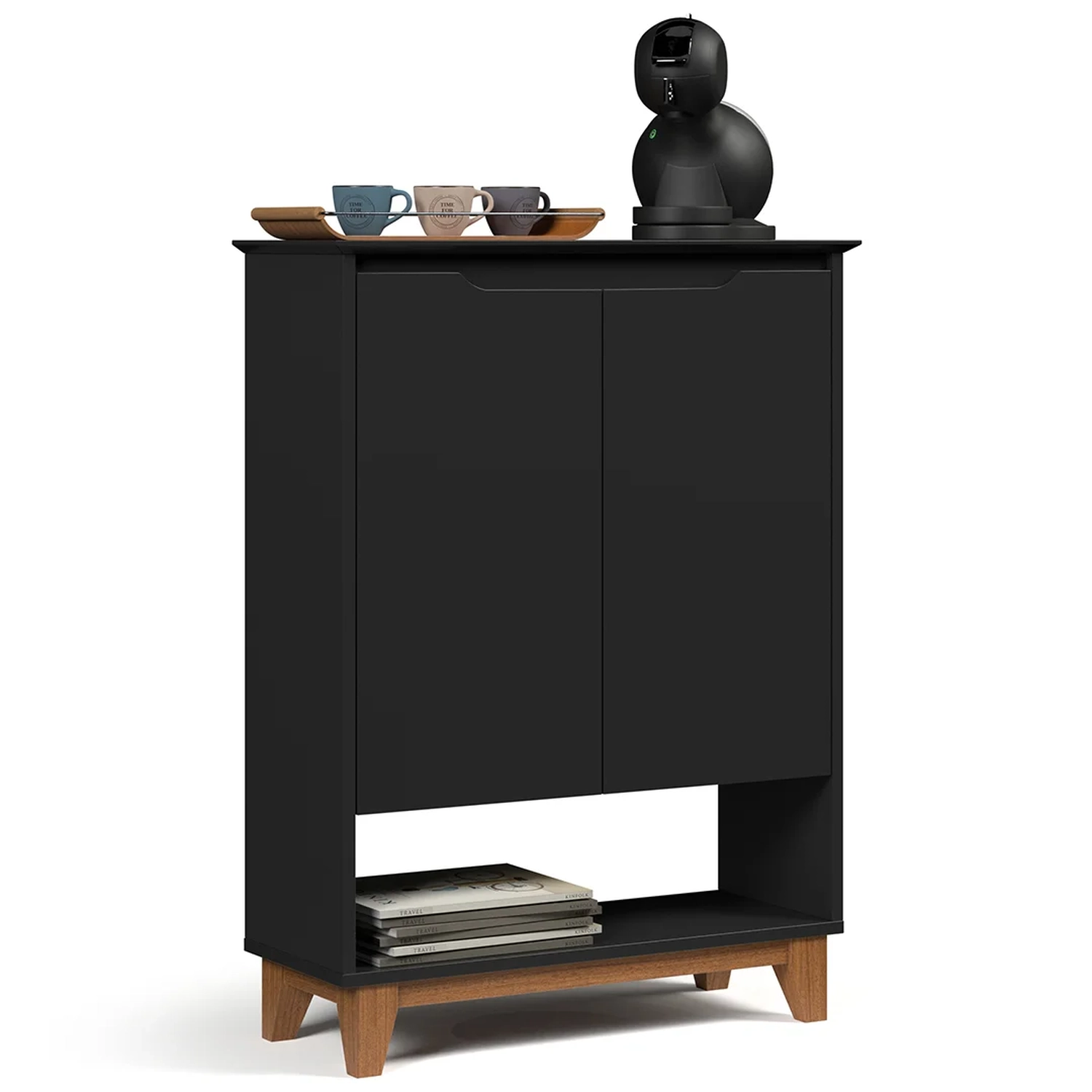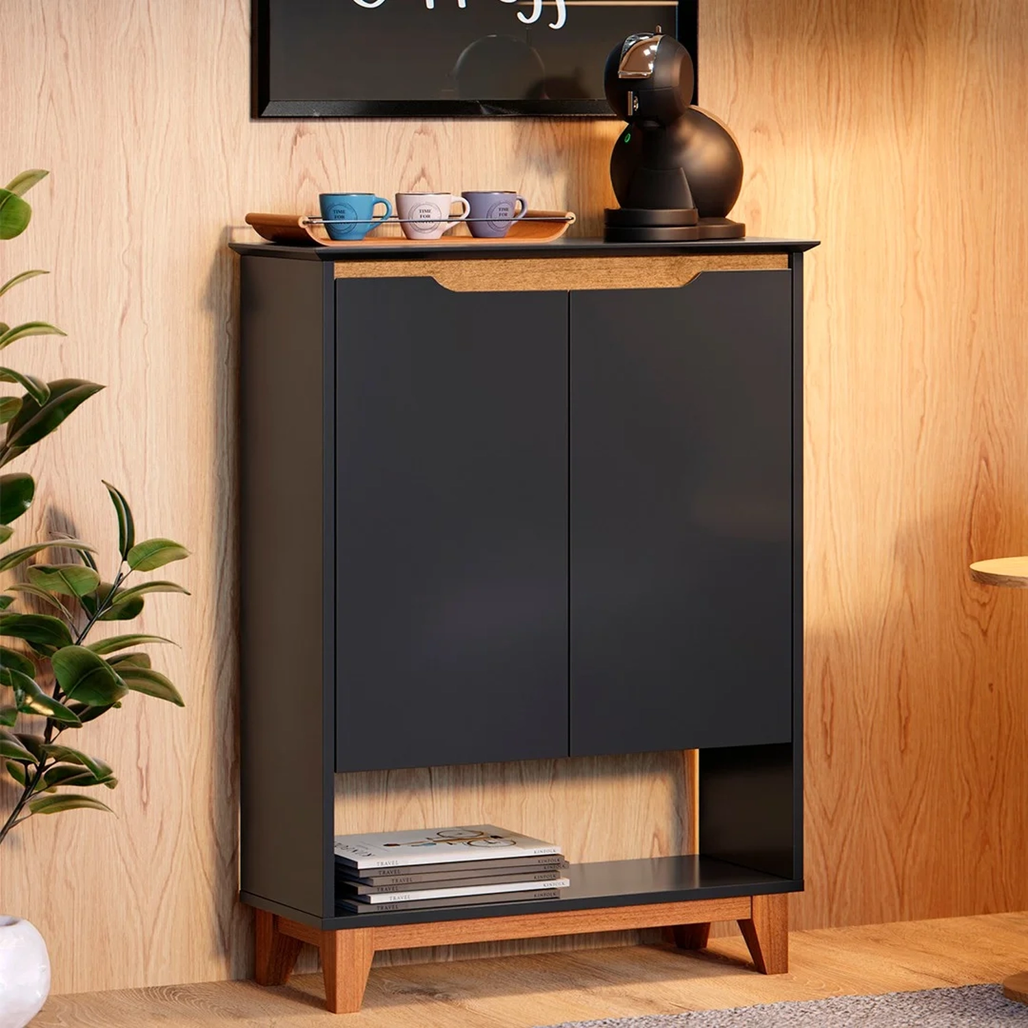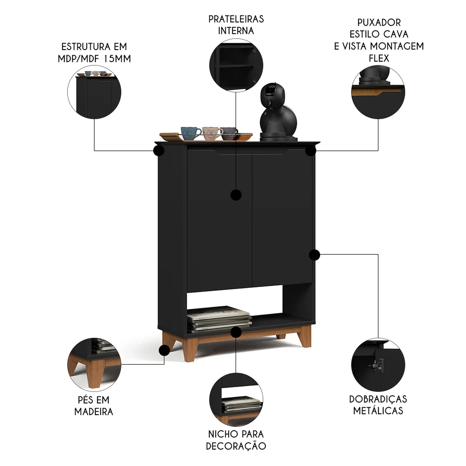 Você já imaginou ter um cantinho exclusivo para preparar suas bebidas favoritas? Um espaço aconchegante, funcional e cheio de charme? Conheça o Aparador Cantinho do Café 2 Portas 68cm Hall Flow Preto, da EJ Móveis, o móvel perfeito para transformar sua casa em uma verdadeira cafeteria gourmet.