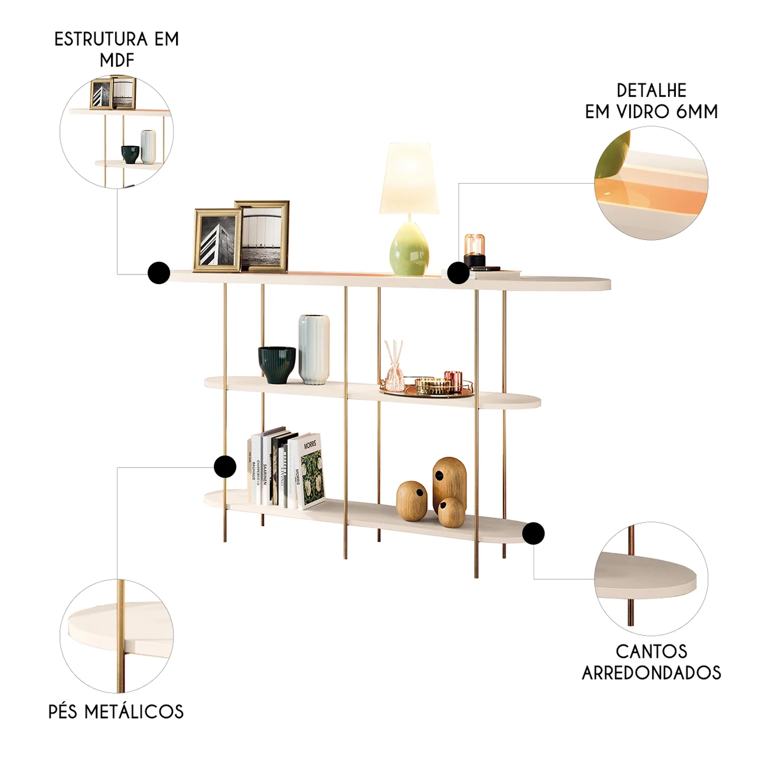 Seu tampo superior conta com um detalhe usinado e um vidro embutido de 6mm, conferindo sofisticação ao design. As duas prateleiras oferecem amplo espaço para objetos decorativos e outros itens, combinando funcionalidade e estilo. Os pés em aço maciço 3/8 com acabamento dourado proporcionam estabilidade e resistência, enquanto adicionam um toque de luxo ao móvel. O Aparador é complementado com 100% MDF, assegurando alta qualidade e durabilidade. Combinando estética refinada e praticidade, este Aparador Para Sala é uma excelente escolha para quem deseja um móvel elegante, funcional e de alta qualidade para complementar sua decoração.
