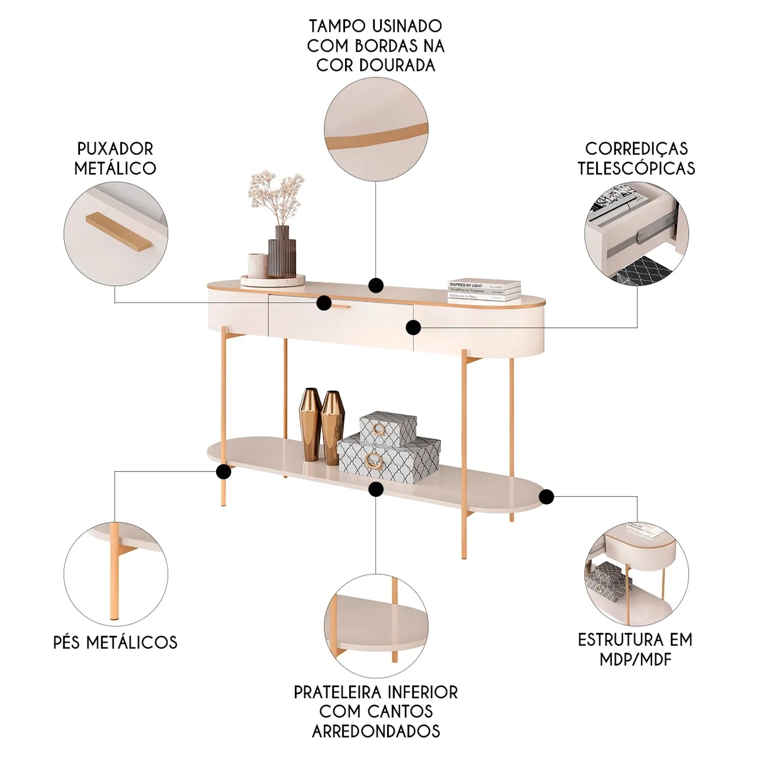 Com design moderno e sofisticado, o Aparador Buffet se destaca pelos cantos arredondados e acabamento refinado em pintura dourada, realçando os detalhes com elegância. Equipado com uma gaveta de puxador metálico dourado e uma prateleira inferior, oferece excelente espaço para organizar objetos e utensílios domésticos. Sua estrutura, reforçada por pés metálicos cilíndricos dourados, garante resistência e facilidade de manutenção. A Mesa de Centro segue o mesmo estilo refinado, com laterais curvas e tampo usinado. A gaveta, equipada com corrediças telescópicas e puxador metálico dourado, foi projetada para oferecer armazenamento eficiente e elegante. Fabricada com materiais de alta qualidade e pés metálicos, a mesa embeleza o ambiente e se integra perfeitamente ao aparador, criando uma atmosfera acolhedora e contemporânea na sua Sala de Estar.
