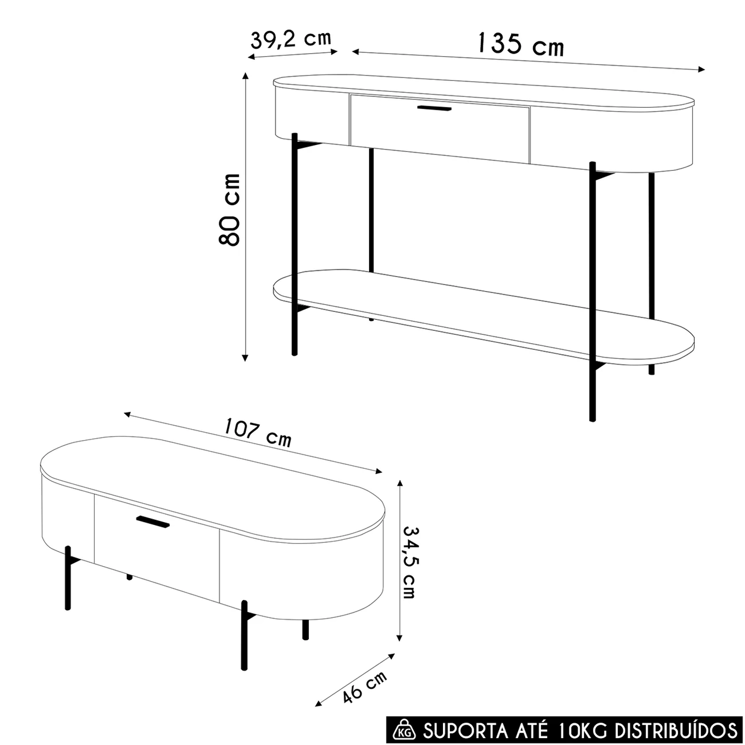 Peso Suportado Distribuídos: 5 kg Aparador/5 kg Mesa.