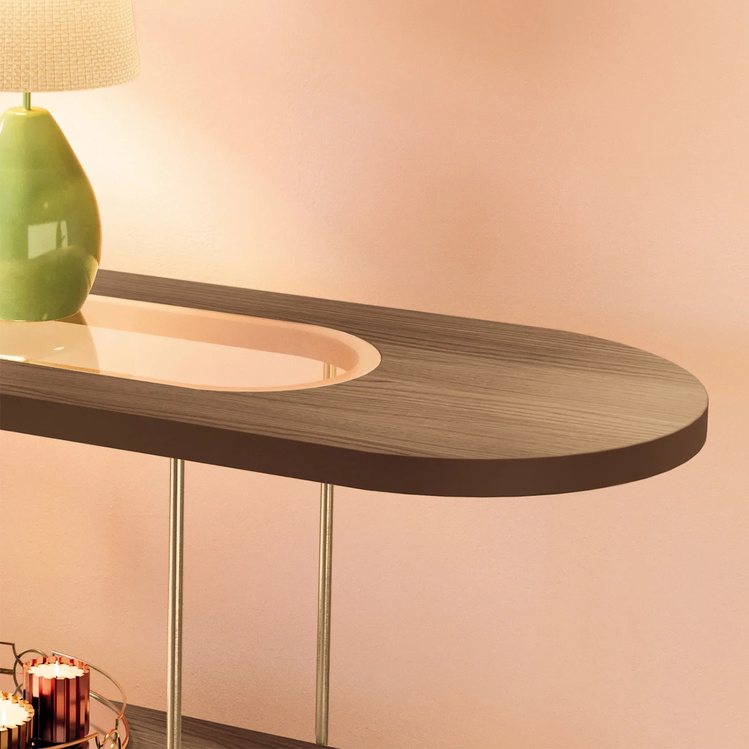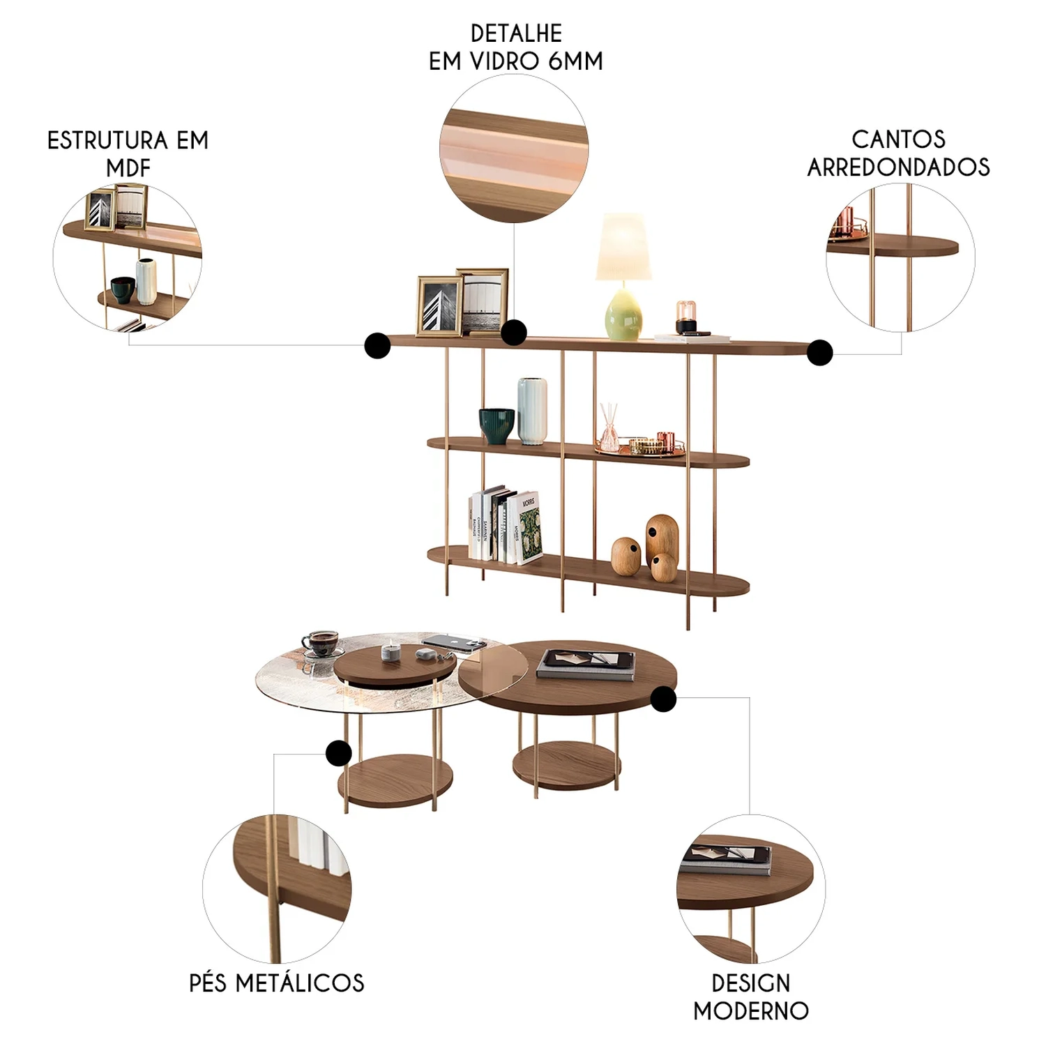 O tampo do Aparador Para Sala em 25mm possui um detalhe usinado com vidro embutido de 6mm, e as prateleiras oferecem amplo espaço para objetos decorativos e livros. As Mesas de Centro é uma perfeita combinação de design contemporâneo e materiais de qualidade. Com tampo em MDF de 25mm em uma das mesas e bordas de vidro 6mm na outra, elas se complementam harmoniosamente. Os pés em aço maciço 3/8 com acabamento dourado do conjunto adicionam um toque sofisticado, garantindo elegância e estabilidade. O aparador e as mesas de centro, com seu design sofisticado e materiais de alta qualidade, são a escolha ideal para transformar e valorizar qualquer espaço, proporcionando sofisticação e funcionalidade.