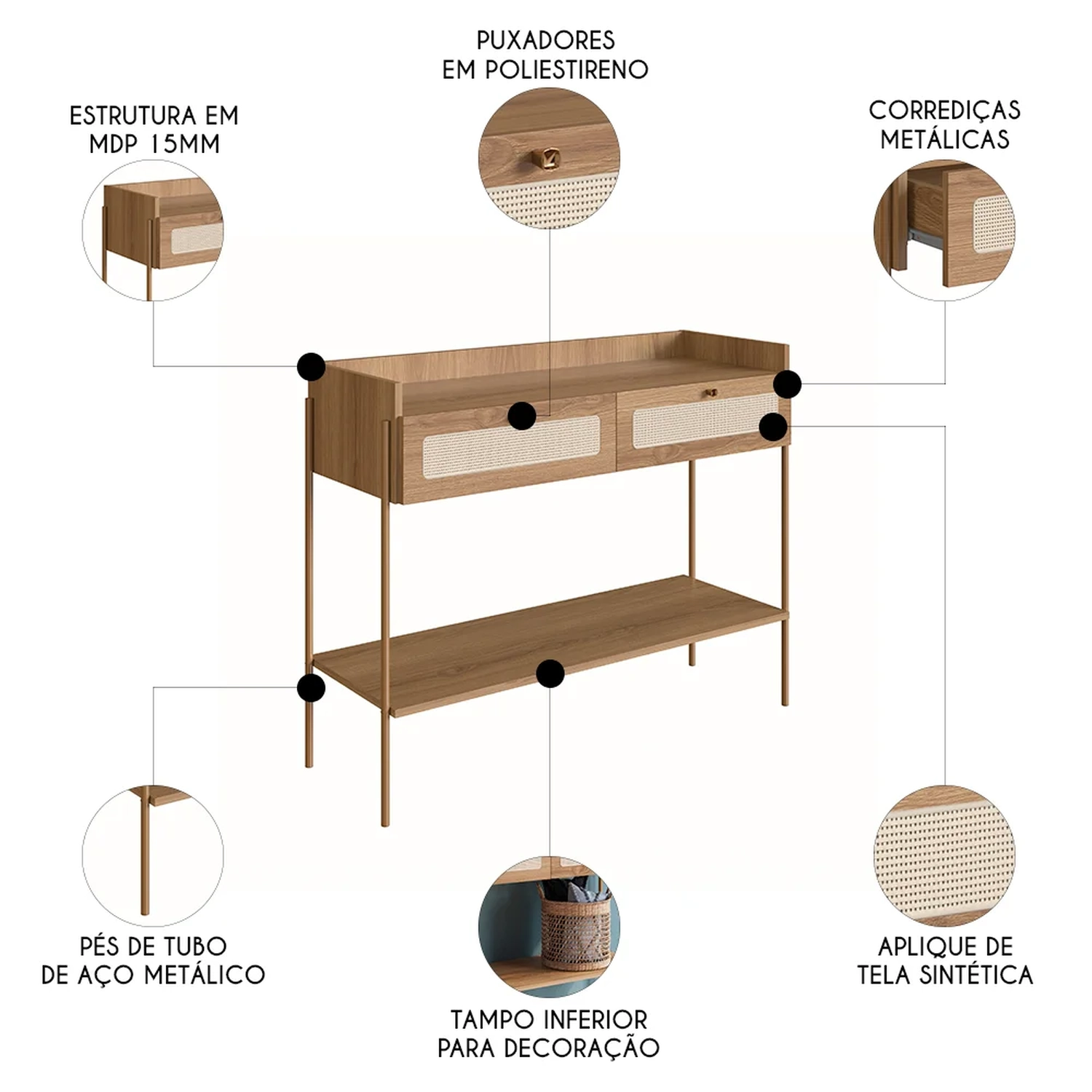 - Detalhes de tela sintética nas gavetas.