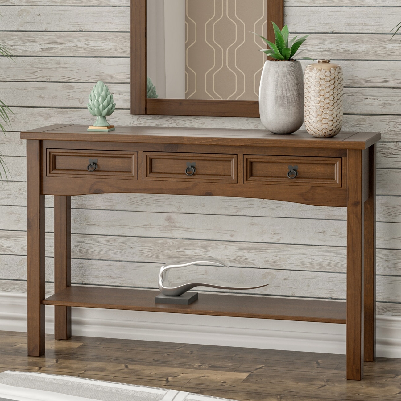 A estrutura robusta em madeira maciça garante resistência e durabilidade, enquanto o tampo com detalhe frisado oferece superfície funcional e elegante para apoiar objetos ou decorar.