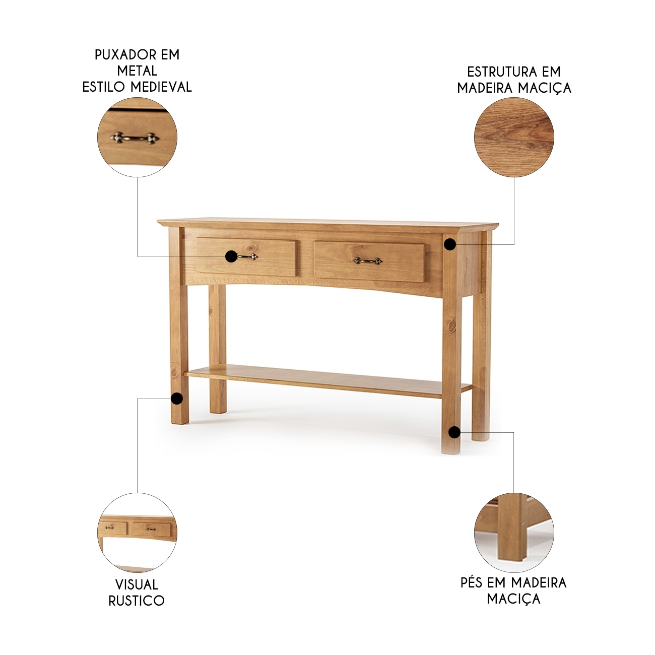 A estrutura firme destaca a beleza natural da Madeira Maciça e garante estabilidade diária, oferecendo tampo funcional que contribui para uma rotina prática.