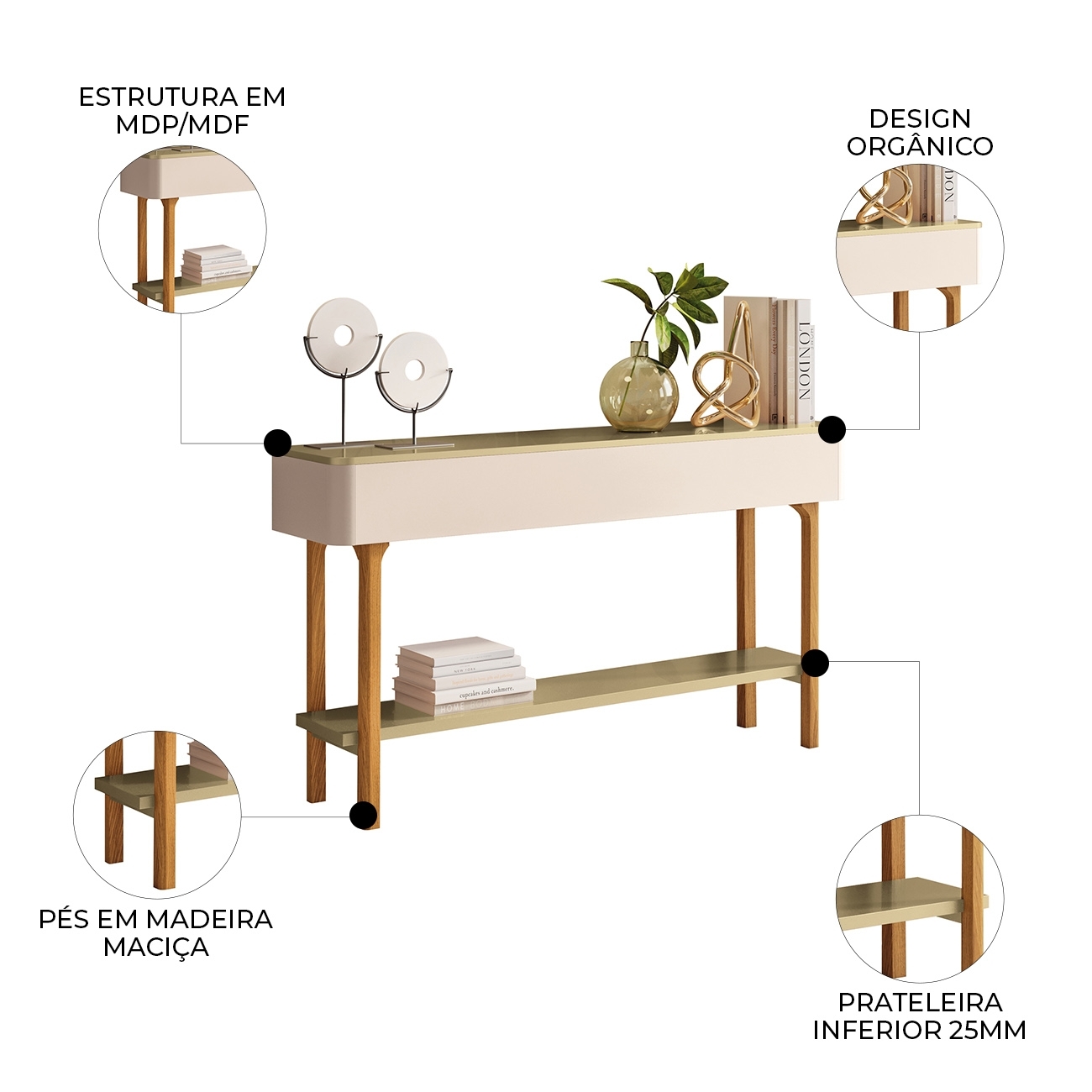 A estrutura em MDF e MDP de 15mm do Aparador garante firmeza no uso diário, enquanto o tampo oferece apoio funcional para objetos decorativos e itens do dia a dia.