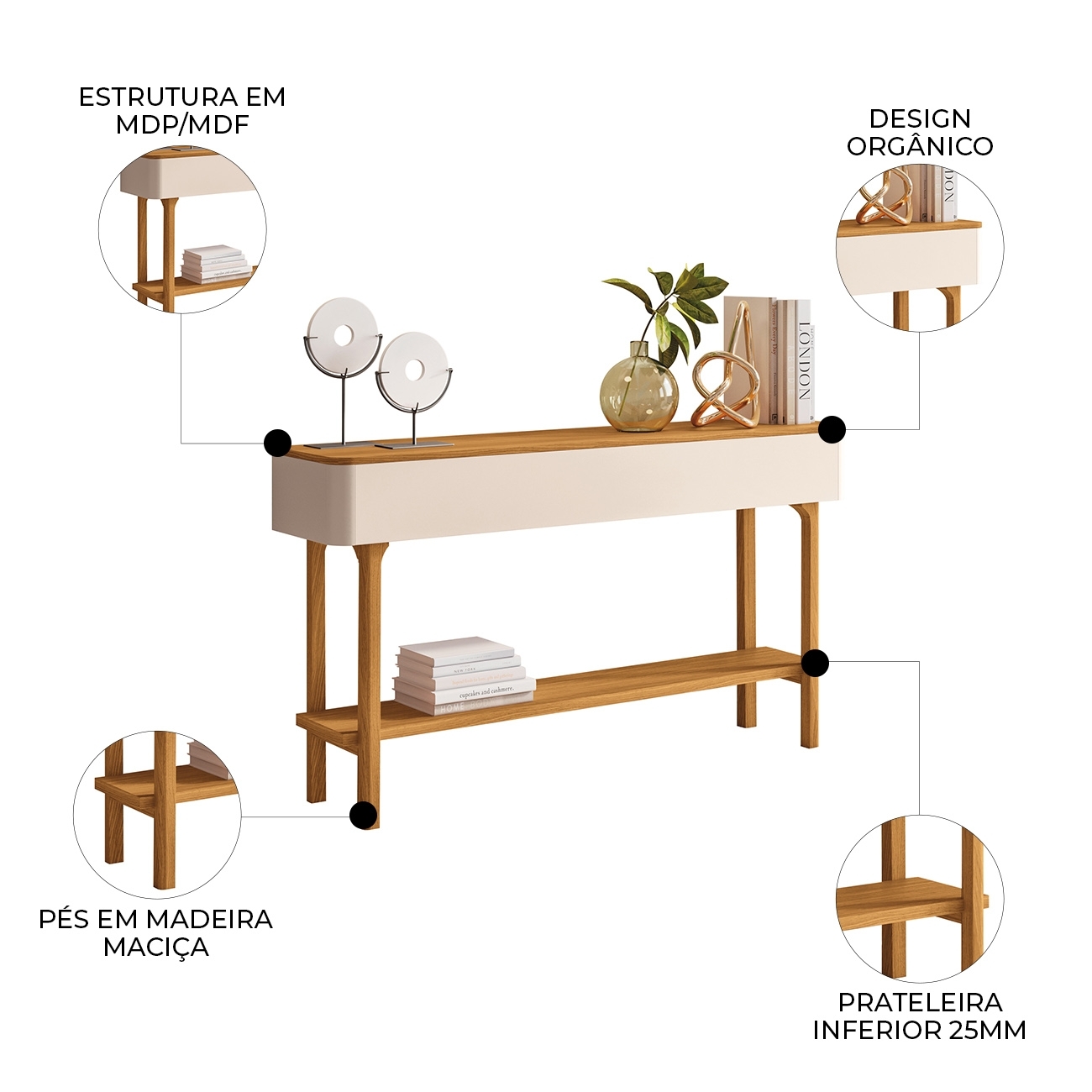A estrutura em MDF e MDP de 15mm do Aparador garante firmeza no uso diário, enquanto o tampo oferece apoio funcional para objetos decorativos e itens do dia a dia.