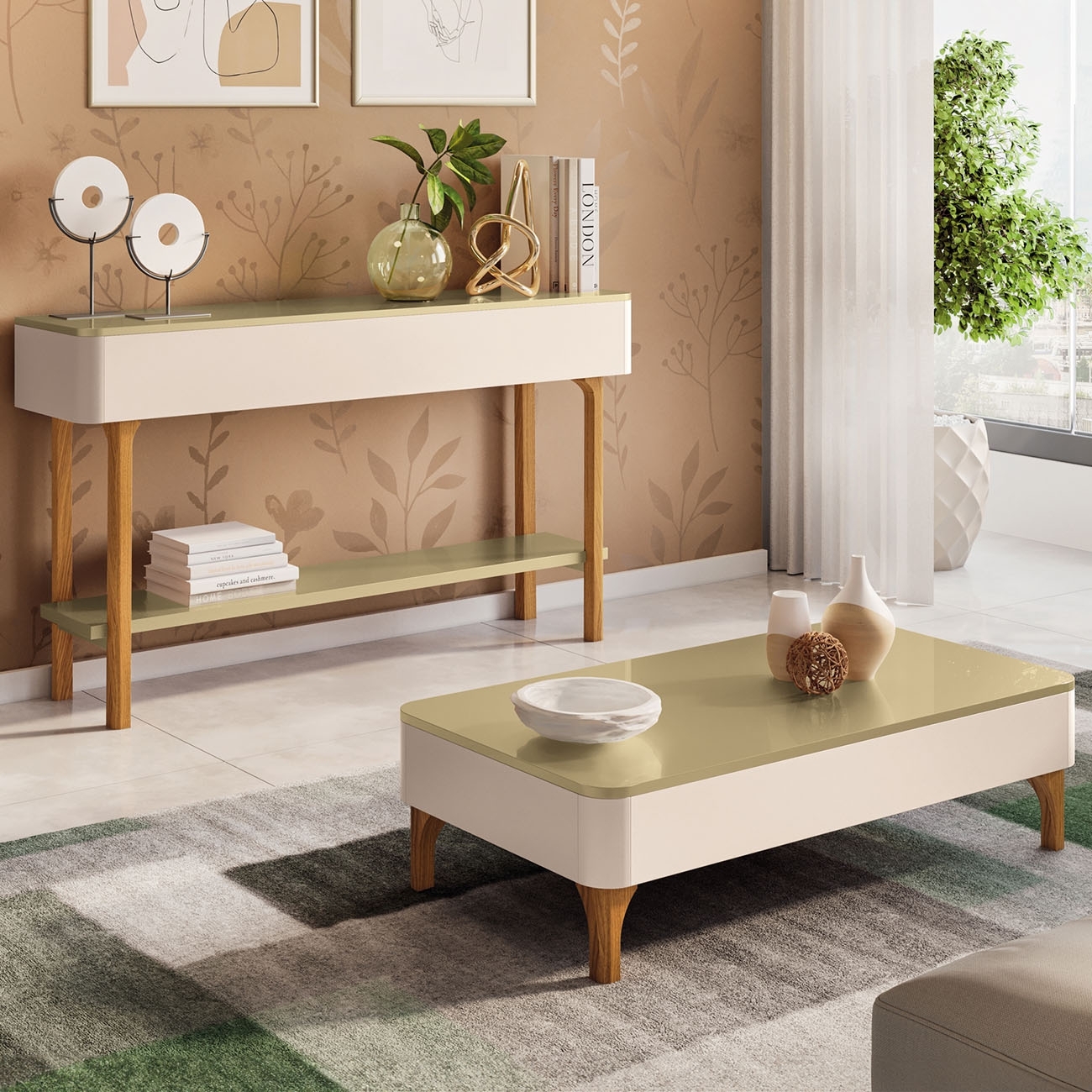 Os Pés Em Madeira maciça, com design exclusivo e acabamento envernizado, estão presentes nas duas peças, elevando o padrão estético do conjunto e destacando sua presença entre os Móveis Decorativos do ambiente.