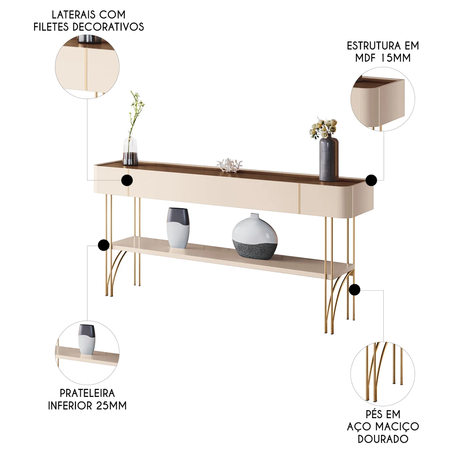 O Aparador de Sala pode ser usado tanto na Sala De Estar quanto no hall de entrada, na cozinha ou no quarto. Ele serve para apoiar objetos decorativos, livros, plantas, luminárias e até mesmo servir de bar. Um modelo que se destaca pela beleza e qualidade é o Aparador Com Prateleira, ideal para compor a decoração ou ser utilizado como divisor de ambientes. Esse aparador tem um design contemporâneo, que combina as formas orgânicas dos cantos arredondados com os filetes decorativos nas laterais, que dão um toque de charme e sofisticação. Fabricado em MDF de 15mm, materiais resistentes e duráveis, que garantem a estabilidade e a segurança do móvel. Os pés são de aço maciço, com acabamento em tom dourado, que conferem elegância e requinte ao aparador. A prateleira inferior de 25mm é perfeita para guardar revistas, cestos ou outros itens que você quiser organizar ou expor. Uma peça que valoriza o seu ambiente, trazendo funcionalidade e estilo para a sua casa.