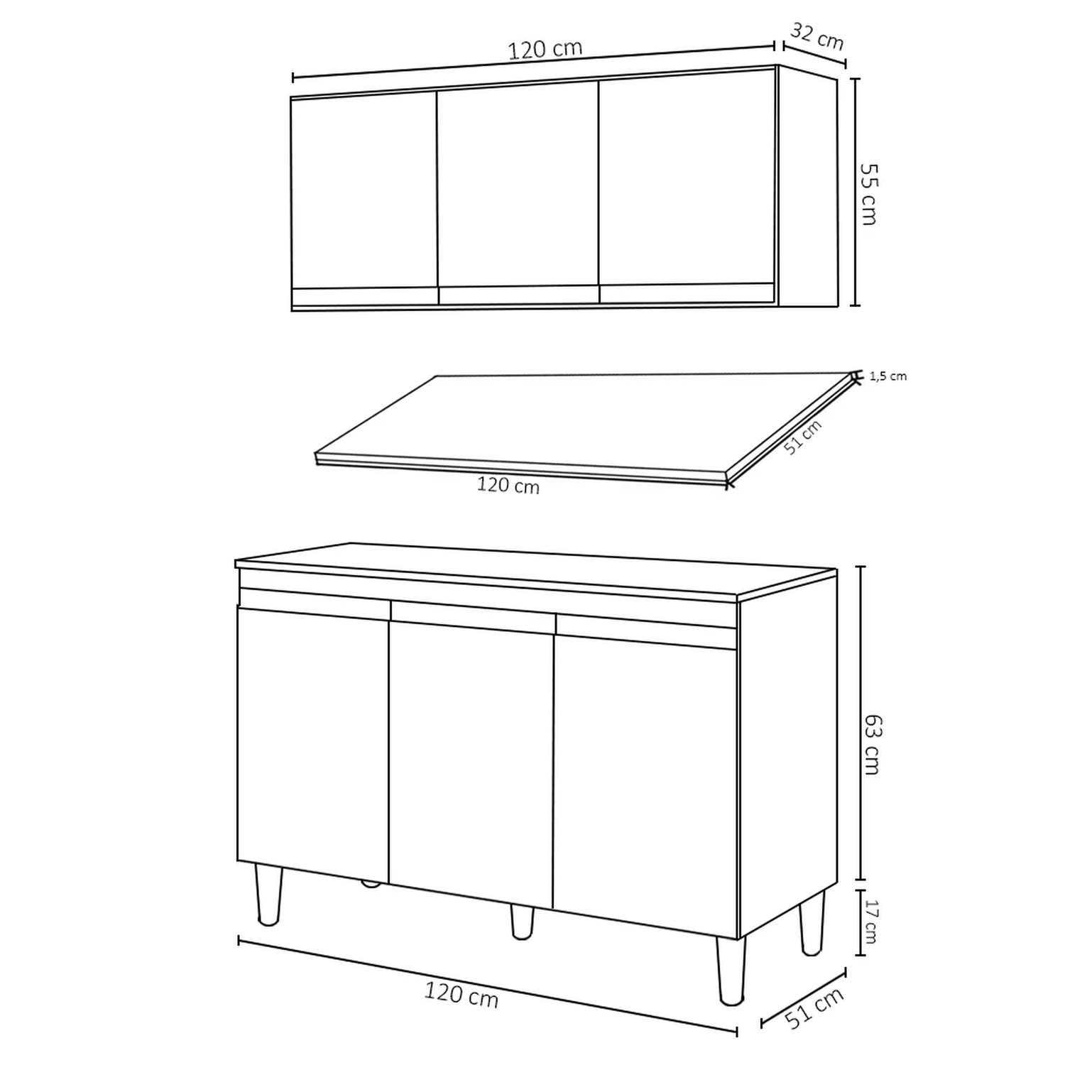 Conteúdo da Embalagem: 1 Balcão 120cm, 1 Armário Aéreo, 1 Tampo.