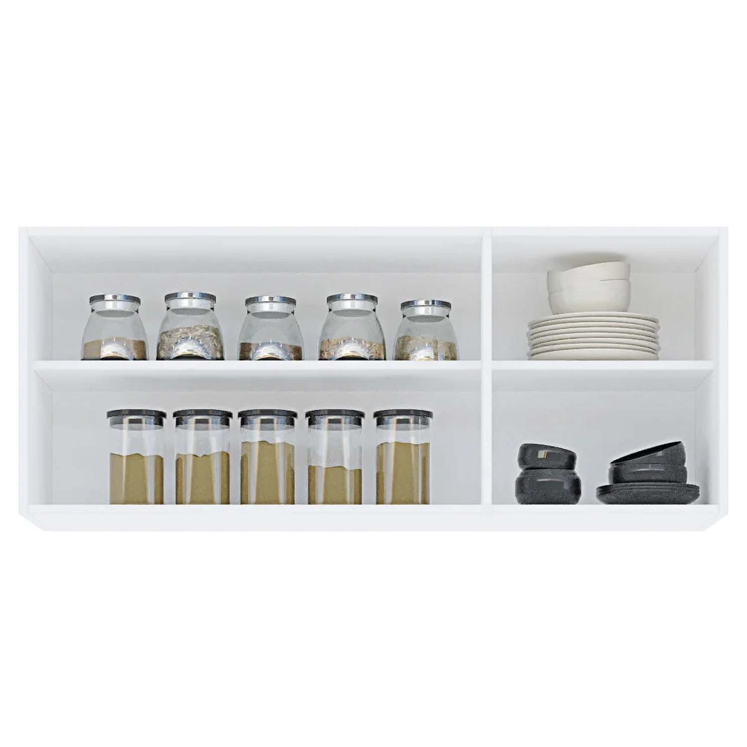 Ele consegue comportar seus potes, mantimentos, equipamentos e qualquer aparato da sua cozinha, tornando o espaço organizado e aconchegante.