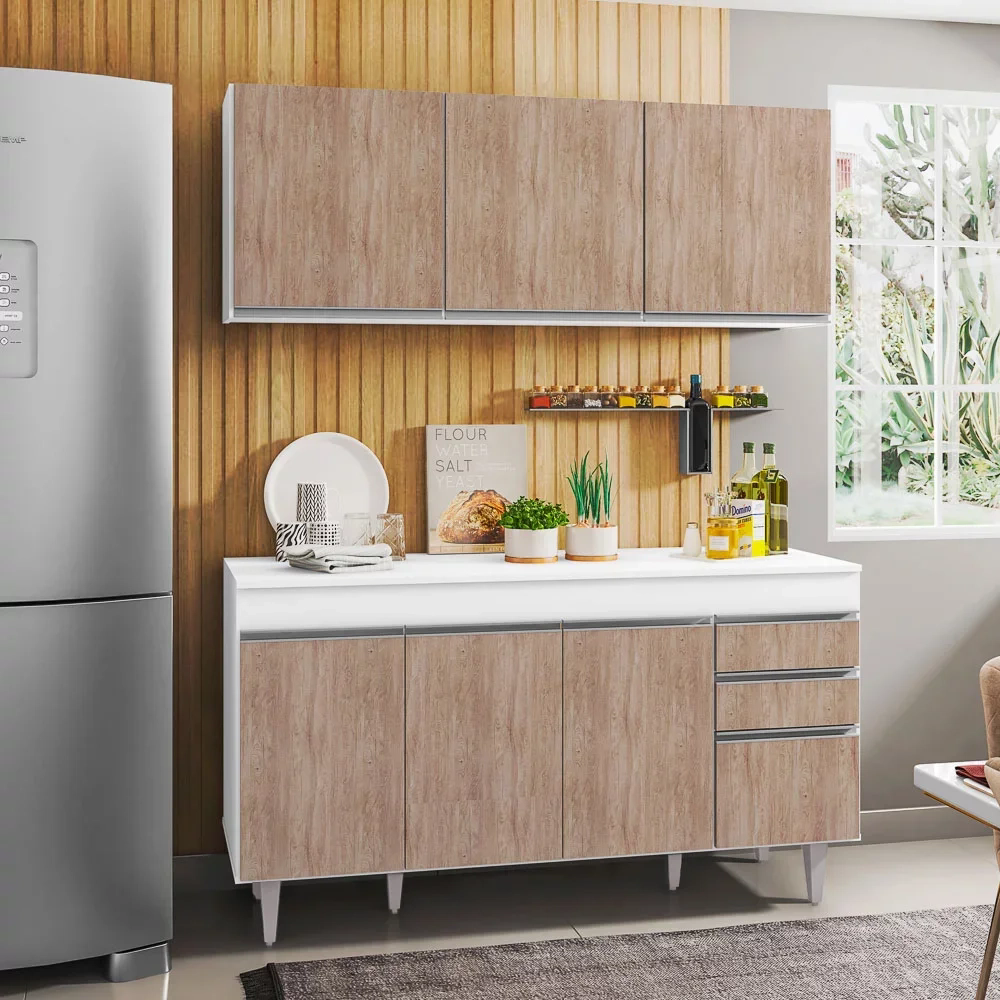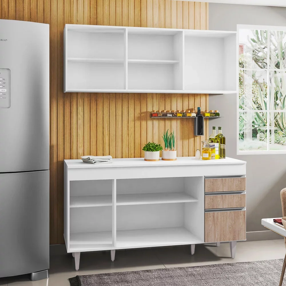 Quanto ao acabamento e estrutura também não há o que questionar, porque são fabricados em MDP 15mm com acabamento BP e os puxadores em alumínio modelo cava dão um toque de modernidade. Para completar, o tampo em MDP 15mm agrega ainda mais utilidade, uma vez que você pode fazer uso de itens decorativos ou até criar aquele cantinho do café, deixando o ambiente muito mais bonito, até porque o coração da casa merece esse cuidado.