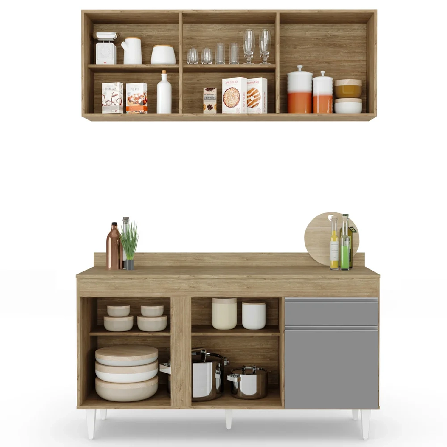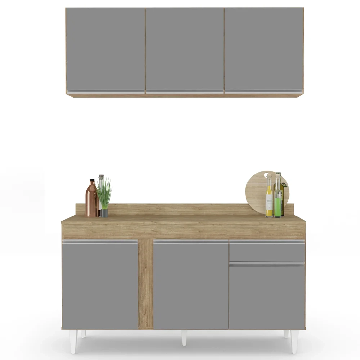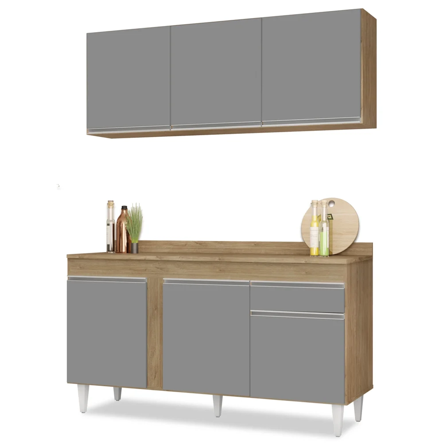 Para quem procura uma Cozinha completa, nós temos a melhor opção, conheça o Armário Aéreo Argélia e Balcão Gabinete com Tampo 150cm Dakota Castanho/Cinza, da Lumil!