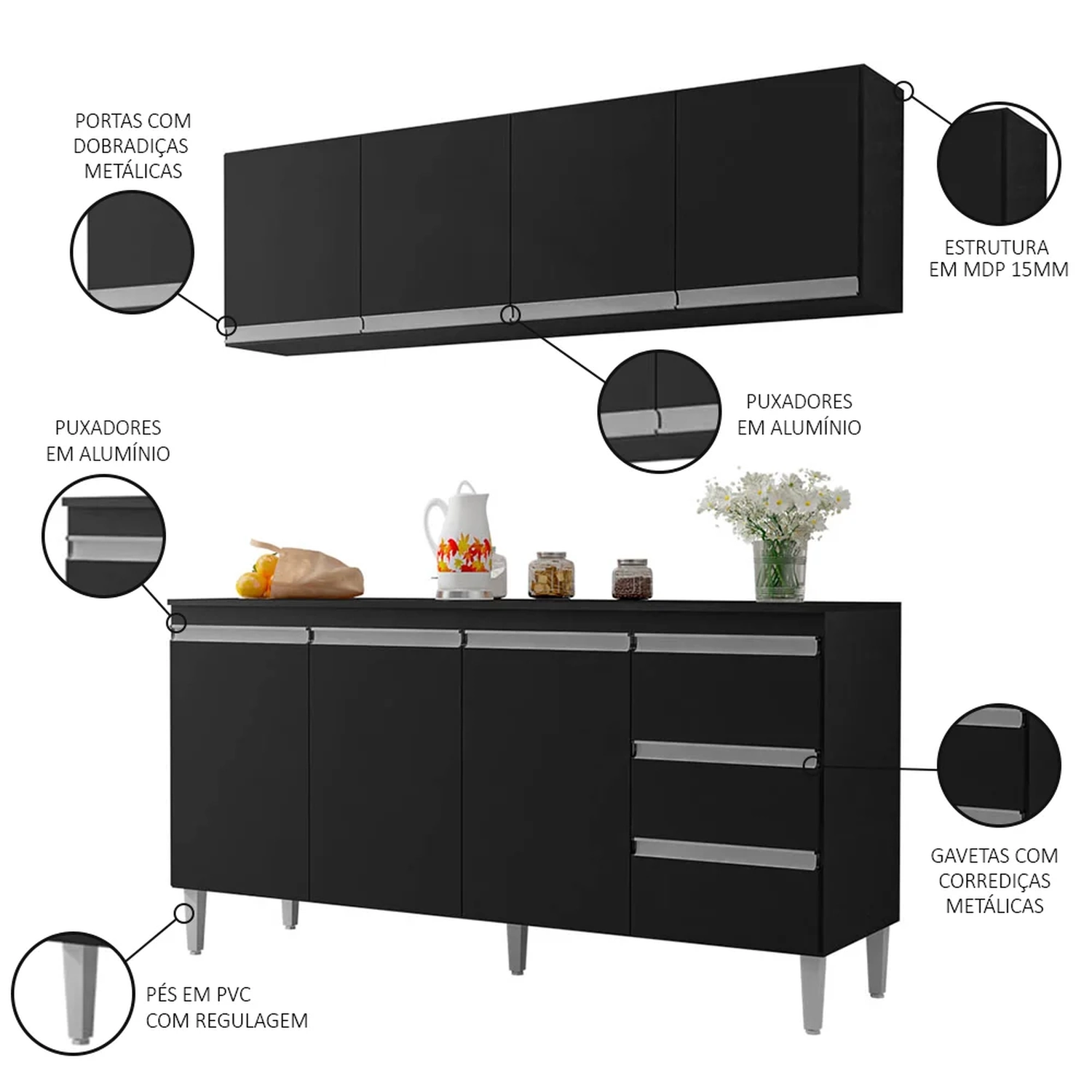 - Puxadores em alumínio.