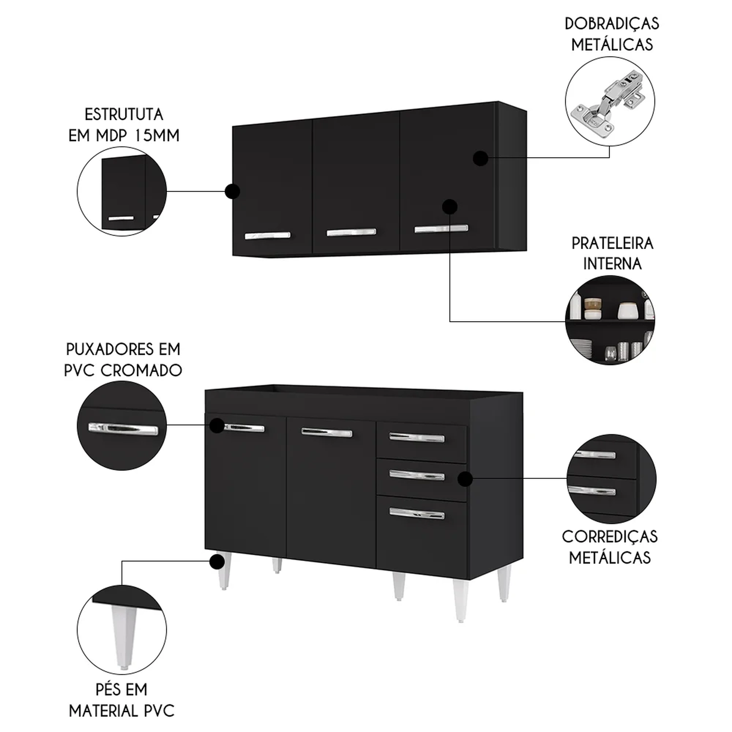 Esse jogo apesar de compacto, é excelente para organizar seus utensílios, panelas, louças e mantimentos. O Armário Aéreo conta com 3 portas que protegem o compartimento interno com 1 prateleira, já o Balcão Gabinete para pia ou tampo de 120cm conta com 3 portas e 2 gavetas e prateleira, ou seja, bastante espaço para manter tudo no lugar e deixar a sua cozinha mais agradável, os puxadores são em PVC cromado, resistentes e fáceis de limpar. Ah! As dobradiças e corrediças são metálicas, garantido a qualidade. Ambos possuem prateleira e estrutura em MDP 15mm com revestimento em BP, o que resulta em um acabamento resistente e duradouro.