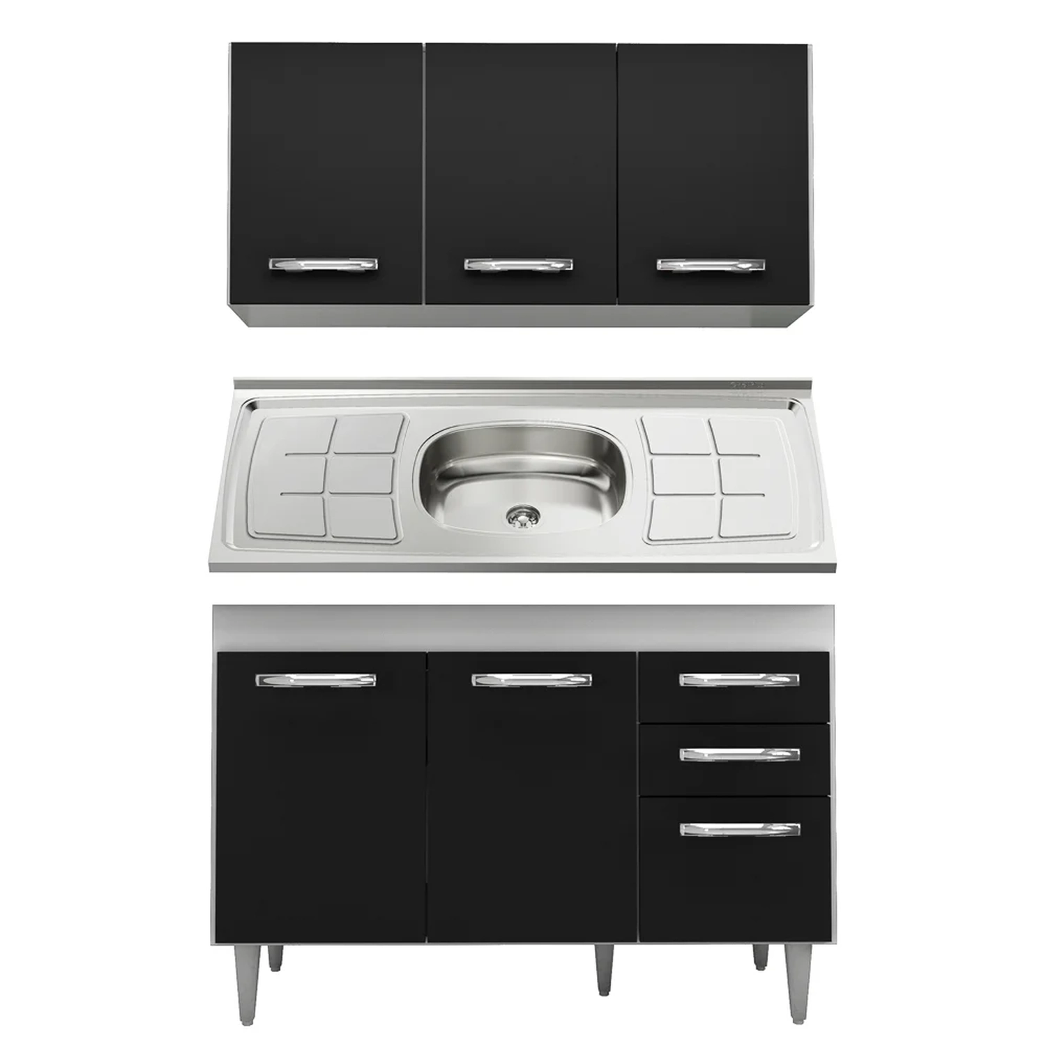 Além disso, a estrutura é feita em MDP/MDF com revestimento em BP, o que resulta em um acabamento resistente e duradouro. Ah, e os pés reguláveis de PVC facilitam o ajuste do móvel de acordo com o nivelamento do piso. Já a pia inox possui cuba central, escorredor duplo, forro em concreto e válvula cromada que facilita no escoamento de água e retenção de resíduos.
