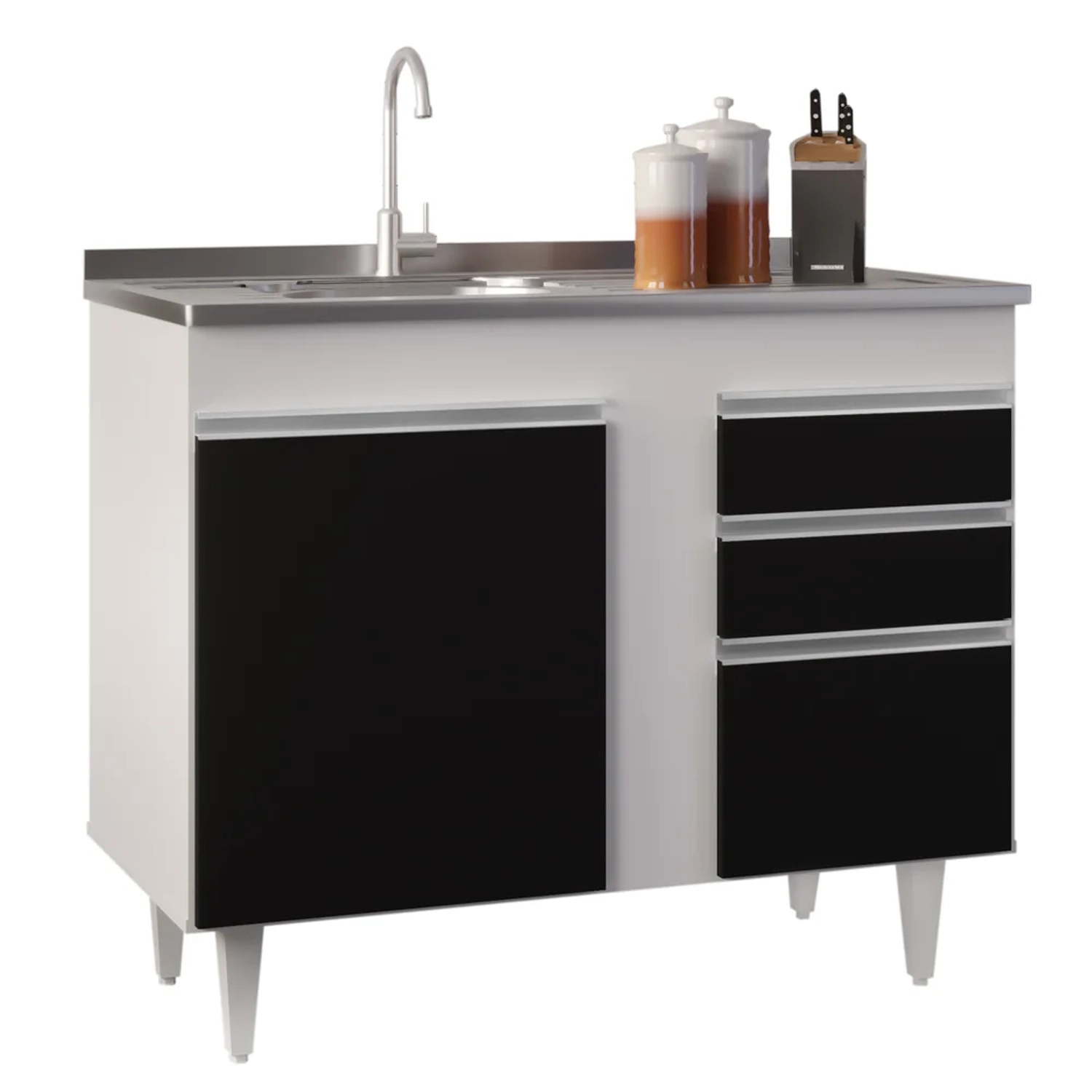 Possui um design clean, ele conta com 2 gavetas super espaçosas, 2 Prateleiras, 4 portas com aberturas convencionais facilitando o manuseio e organização dos seus utensílios e uma excelente pia de inox que permite melhor desempenho ao escoar a água e possibilita a utilização de diversos objetos sobre ela, tudo para te auxiliar no dia a dia.