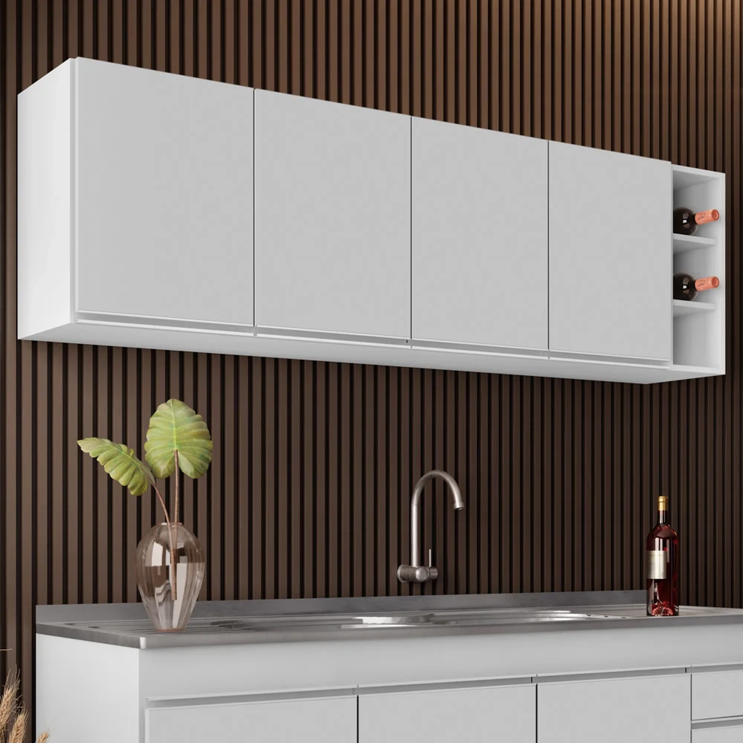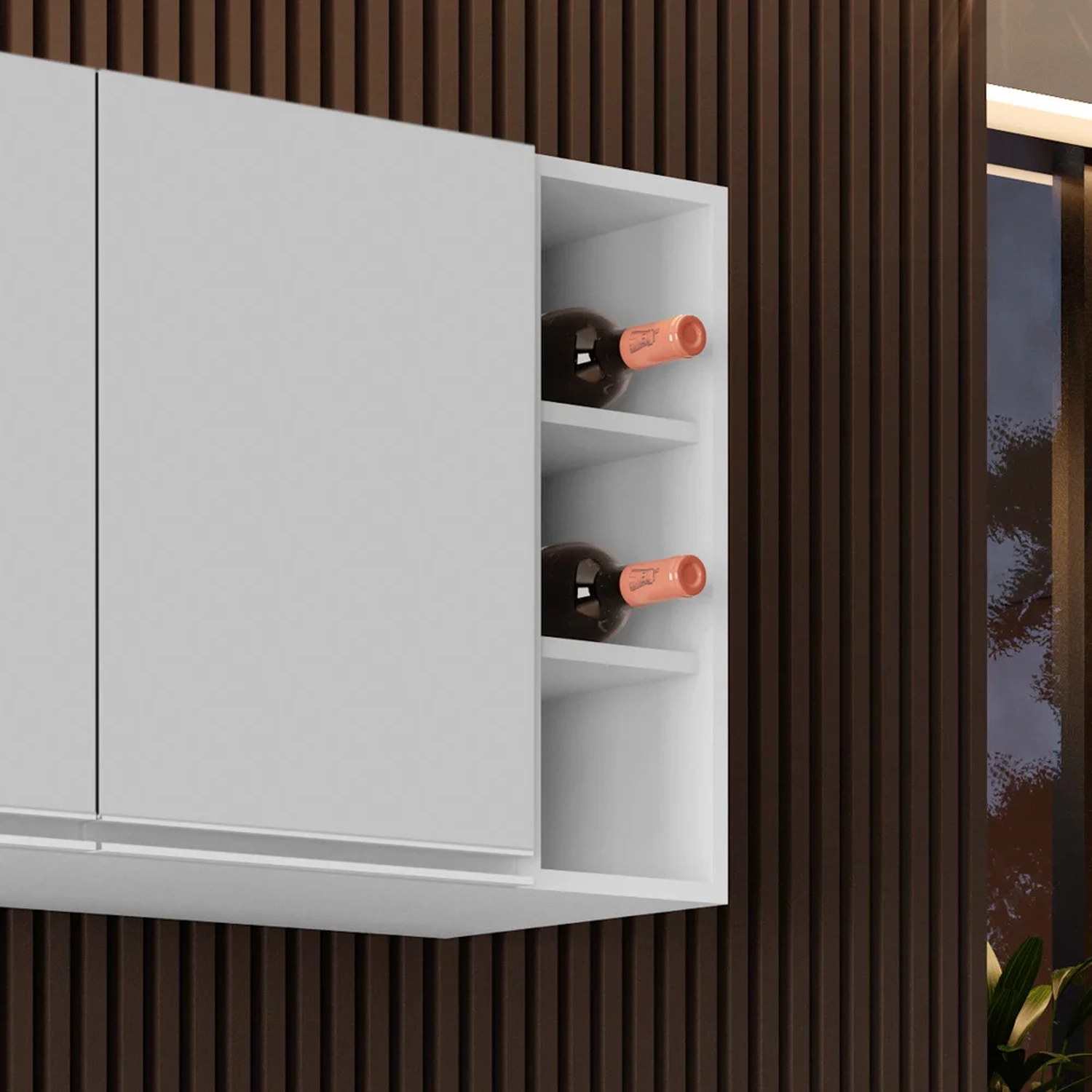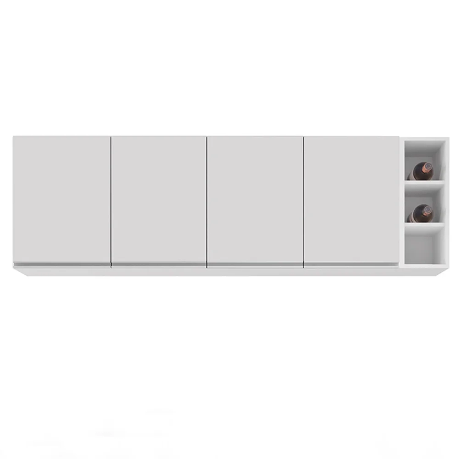 O Armário Aéreo de Cozinha é o item que não pode faltar para deixar esse cômodo prático e funcional, pois, é onde preparamos todas as refeições do dia e precisamos de praticidade na hora de pegar nossos utensílios e mantimentos, o armário vai te ajudar a deixar tudo no devido lugar! Vamos conhecer uma pouco mais sobre esse produto incrível? O Armário Aéreo Nevada possui 4 portas com puxadores em perfil alumínio e ainda conta com 1 prateleira interna oferecendo espaço e organização. Além disso, a estrutura em MDP com acabamento em pintura BP fazem dele um móvel resistente e de alta qualidade. Já o Nicho garrafeiro é ideal para guardar objetos de decoração ou aquele vinho especial.