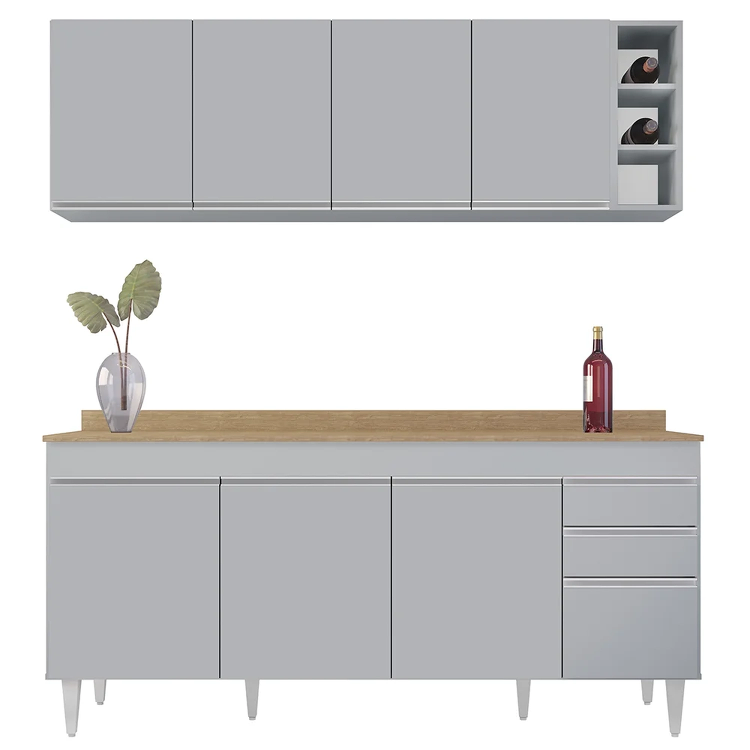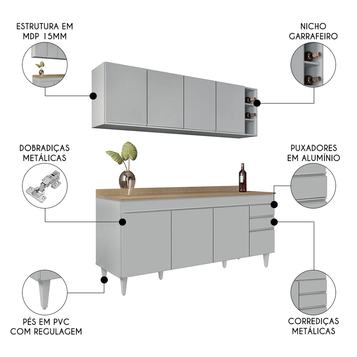 Fabricado em MDP com acabamento em BP, o Balcão Gabinete é uma excelente opção para quem tem uma cozinha com amplo espaço disponível para louças, panelas e demais acessórios utilizados neste ambiente tão especial. Além da estrutura em MDP 15mm, ainda possui 4 portas convencionais e 2 gavetas, todas com dobradiças metálicas e puxadores em alumínio embutidos para facilitar o manuseio. As gavetas acompanham corrediças metálicas e excelente espaço interno para guardar seus talheres e utensílios. O tampo de 180cm que encaixa no balcão é produzido em MDP de alta qualidade, para melhor dispor seus objetos e eletrodomésticos deixando-os sempre à mão, facilitando assim, a organização do seu dia a dia. Para completar a sua tão sonhada Cozinha Moderna, esse conjunto incrível ainda conta com o Armário de Cozinha Aéreo Nevada que possui a mesma estrutura em MDP, 4 portas convencionais, 1 prateleira interna e puxadores em alumínio iguais aos do balcão agregando elegância e charme ao seu ambiente, e 1 Nicho Riad com 3 repartições, ideal para guardar garrafas e objetos de decoração.