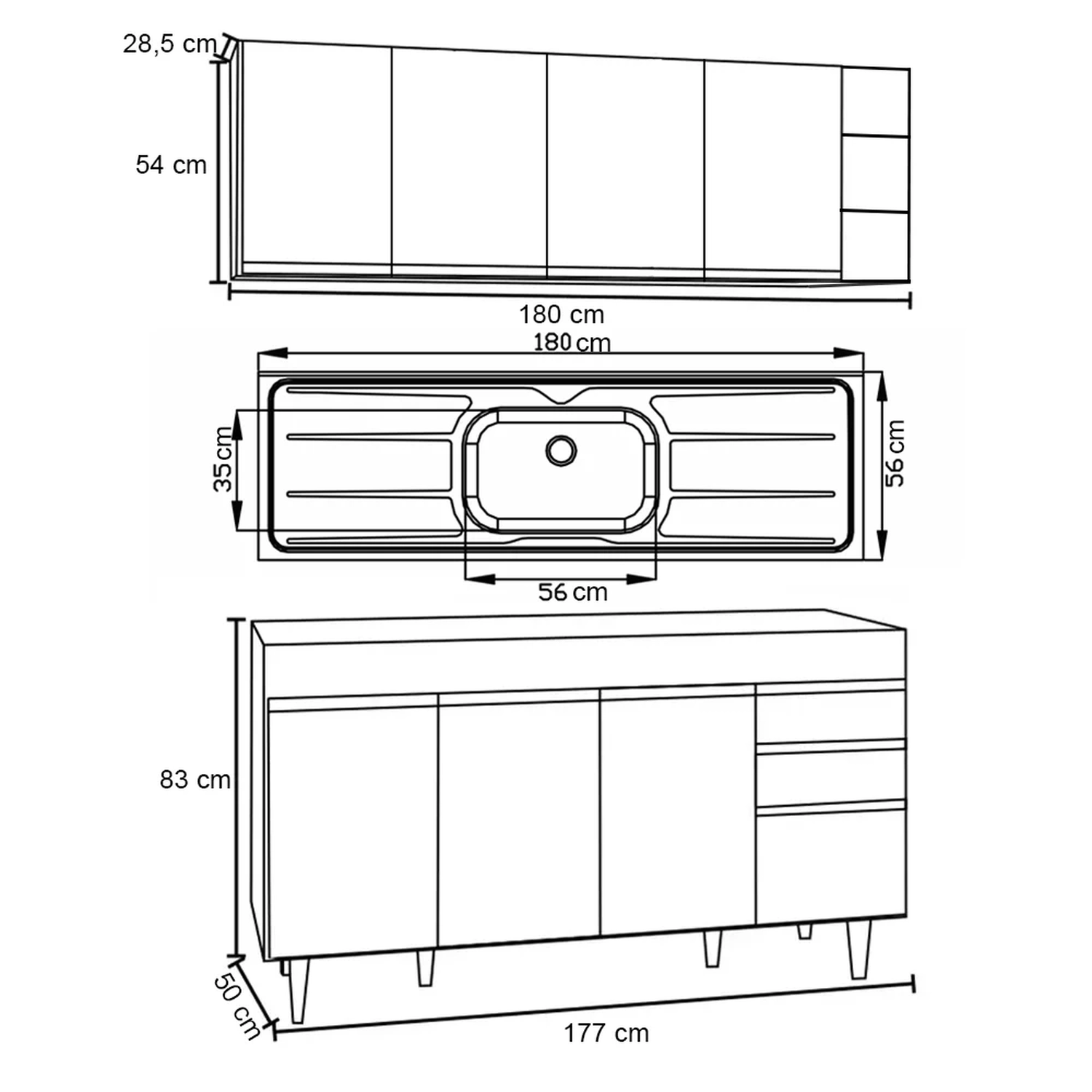 Conteúdo da Embalagem: 1 Balcão, 1 Pia,1 Armário Aéreo, 1 Nicho.