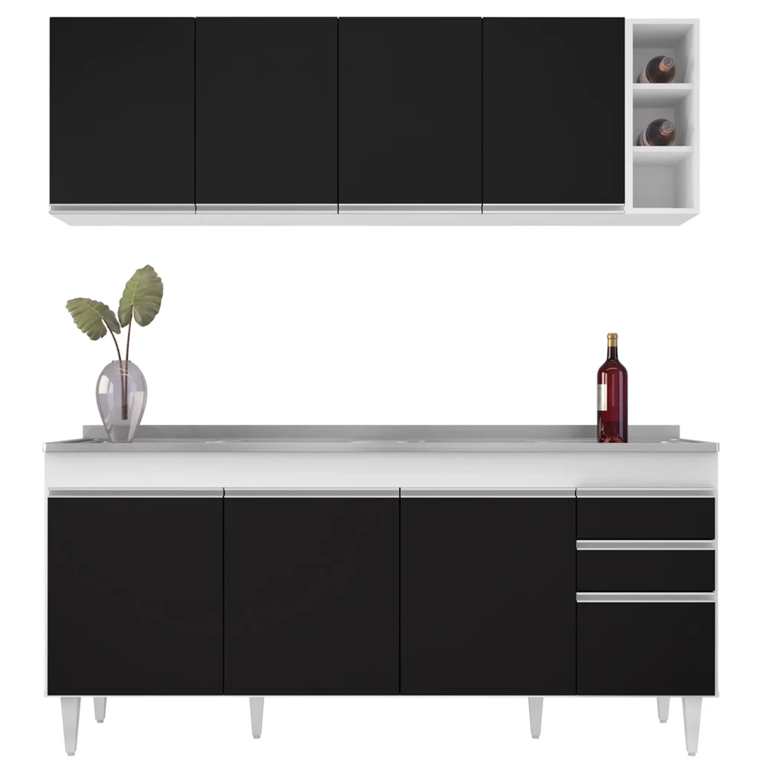 Fabricado em MDP com acabamento em pintura UV, o Balcão Gabinete Dallas Branco/Preto é uma excelente opção para quem tem uma cozinha com amplo espaço disponível para louça, panelas e demais acessórios utilizados neste ambiente que podem ser aproveitados da melhor maneira. Além da estrutura, também conta com pés reguláveis em PVC, 4 portas convencionais com puxador em alumínio embutido e 1 prateleira interna. Além é claro, de 2 gavetas na lateral também com puxadores embutidos para facilitar o manuseio e com corrediças metálicas e espaço ótimo para guardar seus talheres e utensílios. Ah, e ainda é um balcão com pia inox com características que permitem melhor desempenho ao escoar a água e possibilita a utilização de diferentes objetos sobre ela, tudo para te auxiliar! Mas não acaba por aí! Esse conjunto também conta com a praticidade do armário aéreo Nevada e o Nicho Riad, que possuem a mesma estrutura em MDP, o aéreo apresenta 4 portas de puxadores em perfil alumínio e ainda conta com 1 prateleira interna oferecendo espaço e organização, já o nicho adega oferece três repartições para seus utensílios!