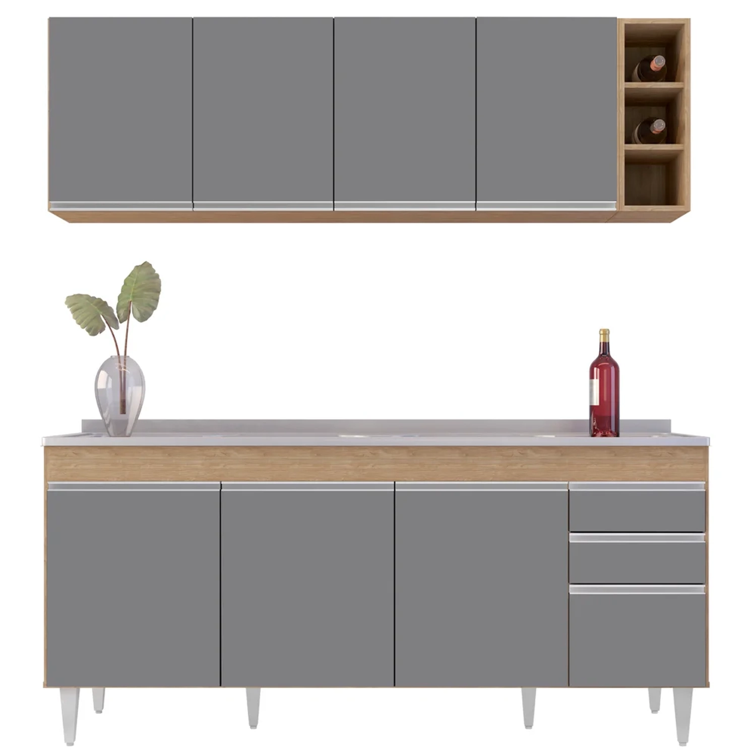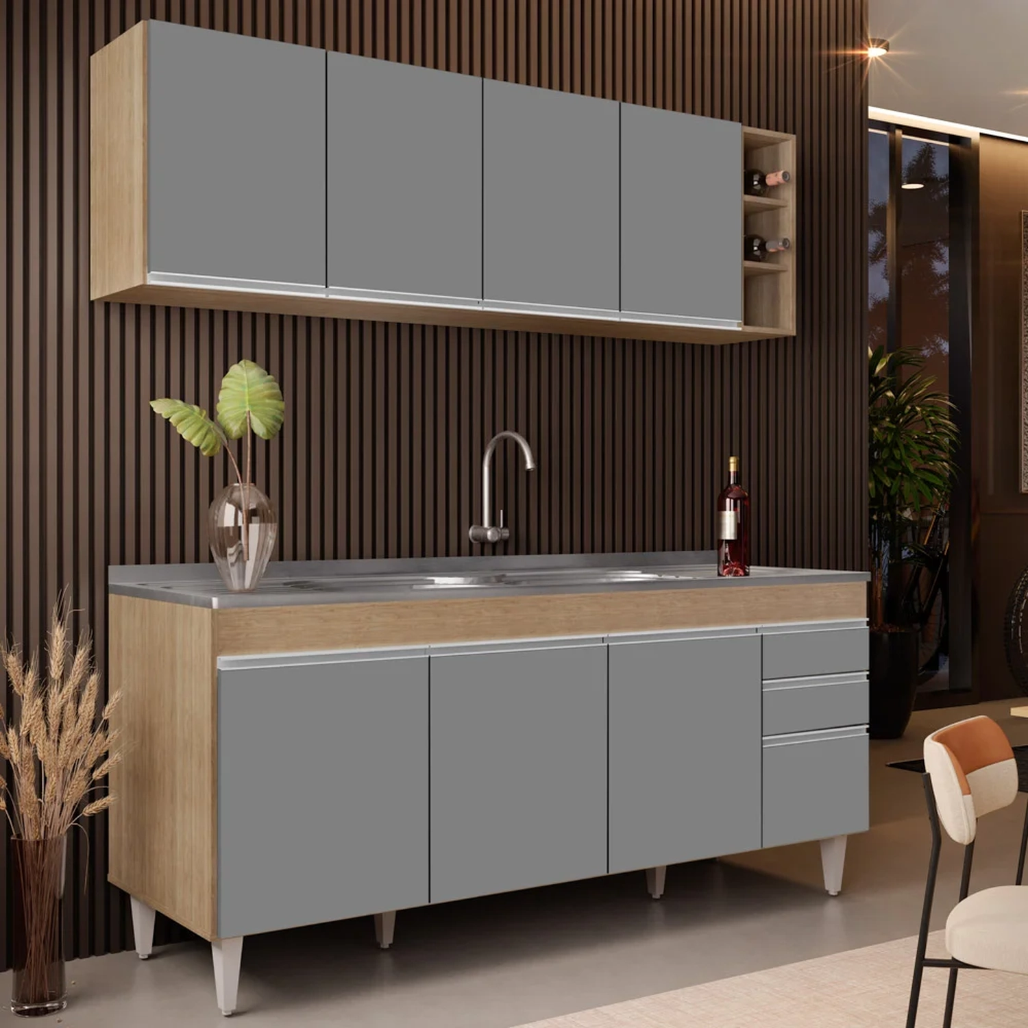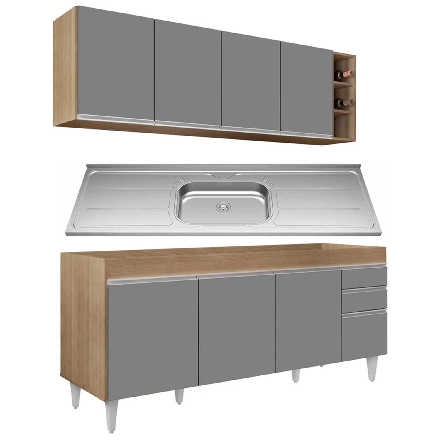 Fabricado em MDP com acabamento em pintura UV, o Balcão Gabinete Dallas Castanho/Cinza é uma excelente opção para quem tem uma cozinha com amplo espaço disponível para louça, panelas e demais acessórios utilizados neste ambiente que podem ser aproveitados da melhor maneira. Além da estrutura, também conta com pés reguláveis em PVC, 4 portas convencionais, com puxador em alumínio embutido e 1 prateleira interna. Além é claro, de 2 gavetas na lateral também com puxadores embutidos para facilitar o manuseio e com corrediças metálicas e espaço ótimo para guardar seus talheres e utensílios. Ah, e ainda é um balcão com pia inox com características que permitem melhor desempenho ao escoar a água e possibilita a utilização de diferentes objetos sobre ela, tudo para te auxiliar! Mas não acaba por aí! Esse conjunto também conta com a praticidade do armário aéreo Nevada e o Nicho Riad, que possuem a mesma estrutura em MDP, o aéreo apresenta 4 portas de puxadores em perfil alumínio e ainda conta com 1 prateleira interna oferecendo espaço e organização, já o nicho adega oferece três repartições para seus utensílios!