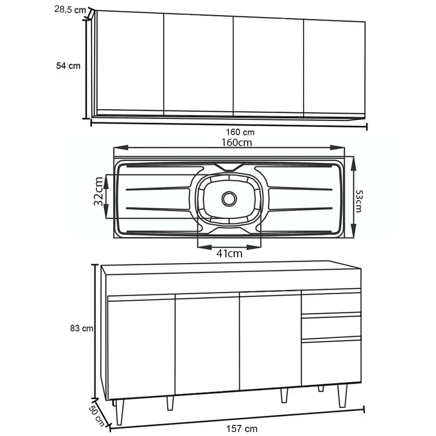 Balcão: 157 cm x 83 cm x 50 cm.