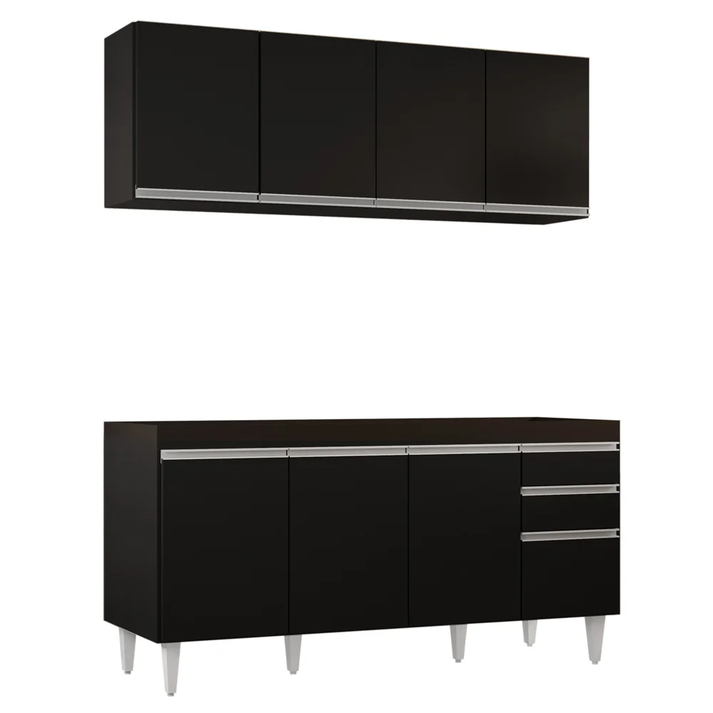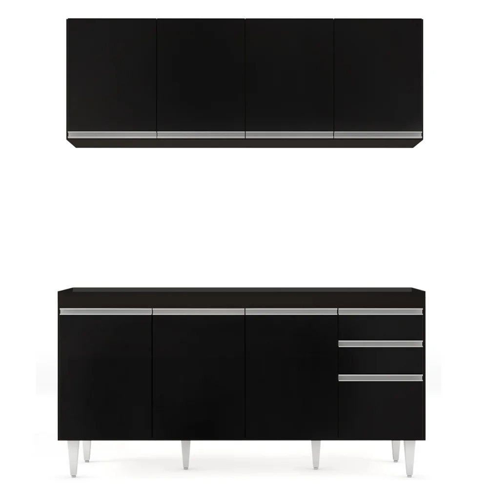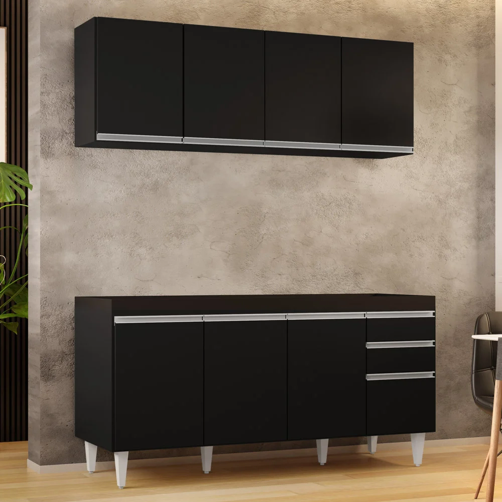 Cozinha, por onde começar? Sem preocupação, vem que a gente te ajuda a ter o ambiente moderno e funcional na medida certa! A começar pelos itens essenciais como o balcão para pia? Sim, o modelo Arkansas Preto da Lumil Móveis é uma ótima alternativa por 4 portas com puxador em perfil metálico contendo amplo espaço interno e 2 gavetas para seus talheres! Ou seja, elementos que fazem toda a diferença no dia a dia. E também o modelo Armário Aéreo Nevada que possui 4 portas de puxadores em perfil alumínio e ainda conta com 1 prateleira interna oferecendo espaço e organização Ah, e tudo em MDP com acabamento em pintura BP e pés em PVC para sustentação do móvel!!
