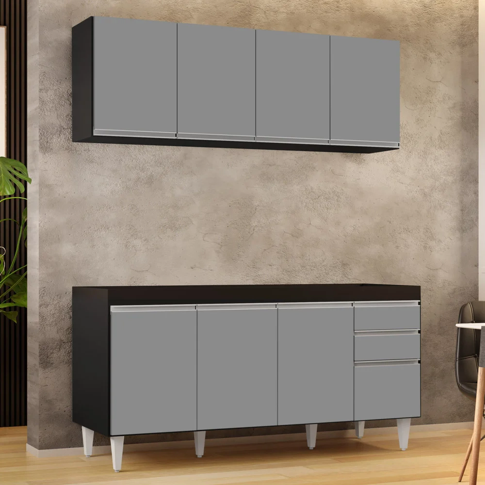 Cozinha, por onde começar? Sem preocupação, vem que a gente te ajuda a ter o ambiente moderno e funcional na medida certa! A começar pelos itens essenciais como o balcão para pia? Sim, o modelo Arkansas Preto/Cinza da Lumil Móveis é uma ótima alternativa por 4 portas com puxador em perfil metálico contendo amplo espaço interno e 2 gavetas para seus talheres! Ou seja, elementos que fazem toda a diferença no dia a dia. E também o modelo Armário Aéreo Nevada que possui 4 portas de puxadores em perfil alumínio e ainda conta com 1 prateleira interna oferecendo espaço e organização Ah, e tudo em MDP com acabamento em pintura BP e pés em PVC para sustentação do móvel!!