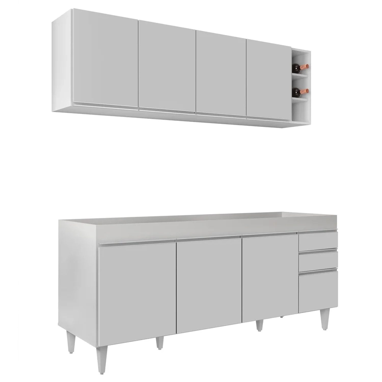 Para completar a sua tão sonhada Cozinha Moderna, esse conjunto incrível ainda conta com o Armário Aéreo Nevada que possui a mesma estrutura em MDP, 4 portas convencionais, 1 prateleira interna e puxadores em alumínio iguais aos do Balcão agregando elegância e charme ao seu ambiente, e 1 Nicho Riad com 3 repartições, ideal para guardar garrafas e objetos de decoração.