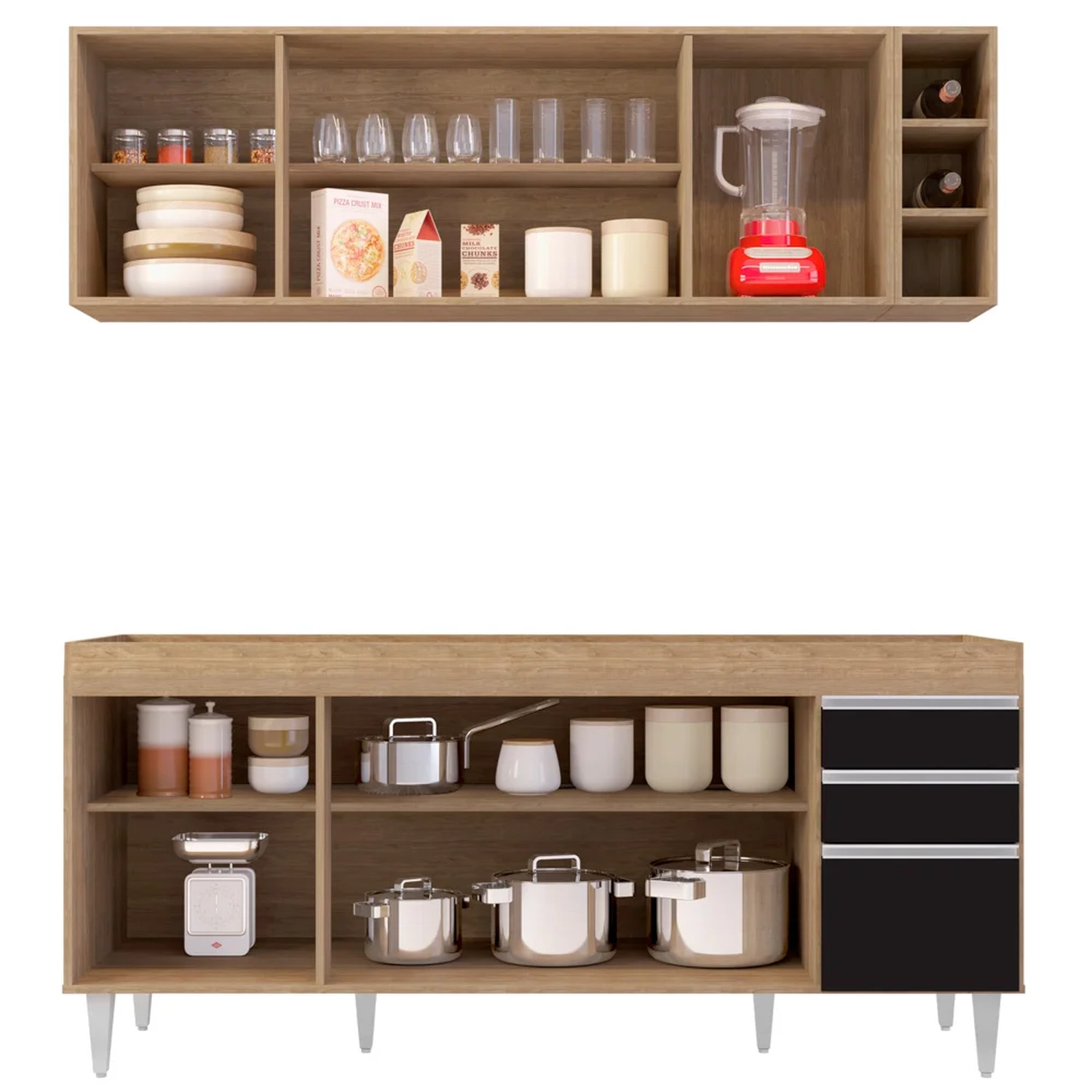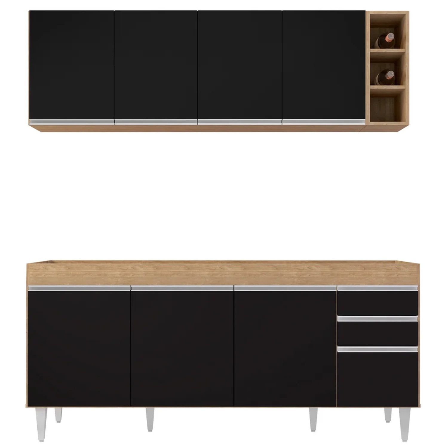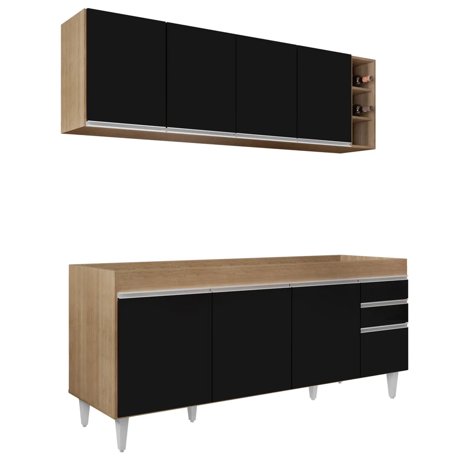 Para completar a sua tão sonhada Cozinha Moderna, esse conjunto incrível ainda conta com o Armário Aéreo Nevada que possui a mesma estrutura em MDP, 4 portas convencionais, 1 prateleira interna e puxadores em alumínio iguais aos do Balcão agregando elegância e charme ao seu ambiente, e 1 Nicho Riad com 3 repartições, ideal para guardar garrafas e objetos de decoração.