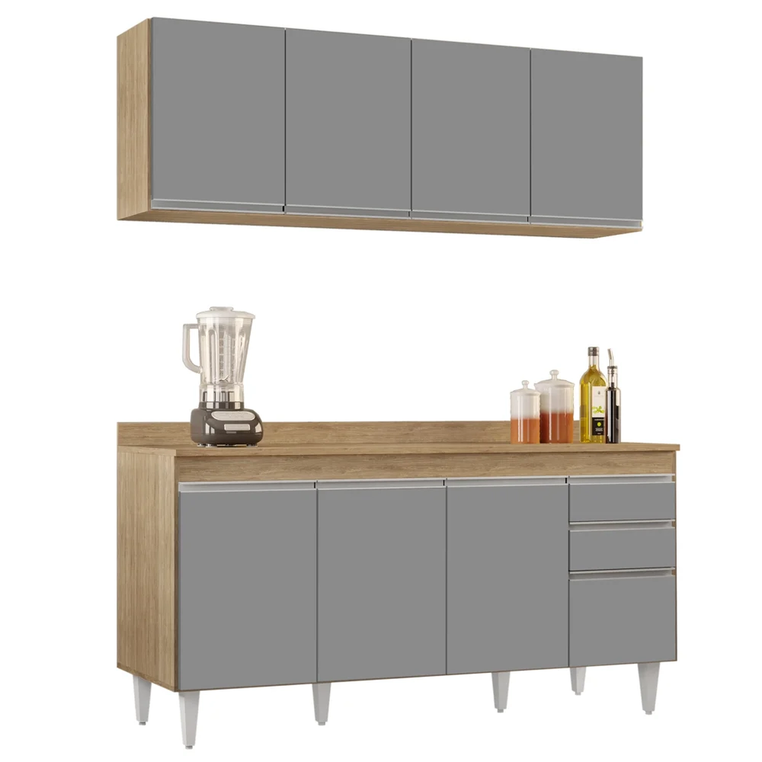 O Balcão Arkansas possui 4 portas, 2 gavetas e 1 prateleira conferindo um ótimo espaço interno para guardar panelas, eletrodomésticos e mantimentos. Além disso, acompanha pés reguláveis que facilitam a posição do móvel. O Armário Nevada possui 4 portas e 1 prateleira para guardar copos, temperos e potes. E para completar a sua cozinha, esse kit acompanha um Tampo de 160 que encaixa perfeitamente no balcão, aqui você pode colocar tudo o que mais utiliza no dia a dia para facilitar a rotina, também pode acrescentar objetos de decoração ou fazer um lindo cantinho do café. Todos os produtos são produzidos em MDP/MDF com revestimento em BP e acabamento conta com fita de borda em papel, resultando em produtos resistentes, duráveis e confiáveis.