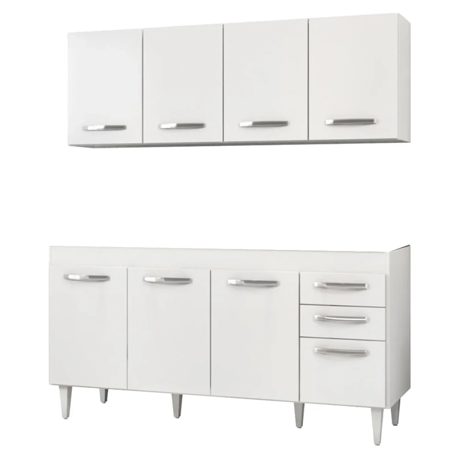 O armário conta com 4 portas que protegem o compartimento interno com 1 prateleira; já o balcão gabinete para pia conta com 4 portas e 2 gavetas, ou seja, bastante espaço para manter tudo no lugar e deixar a sua cozinha mais agradável.