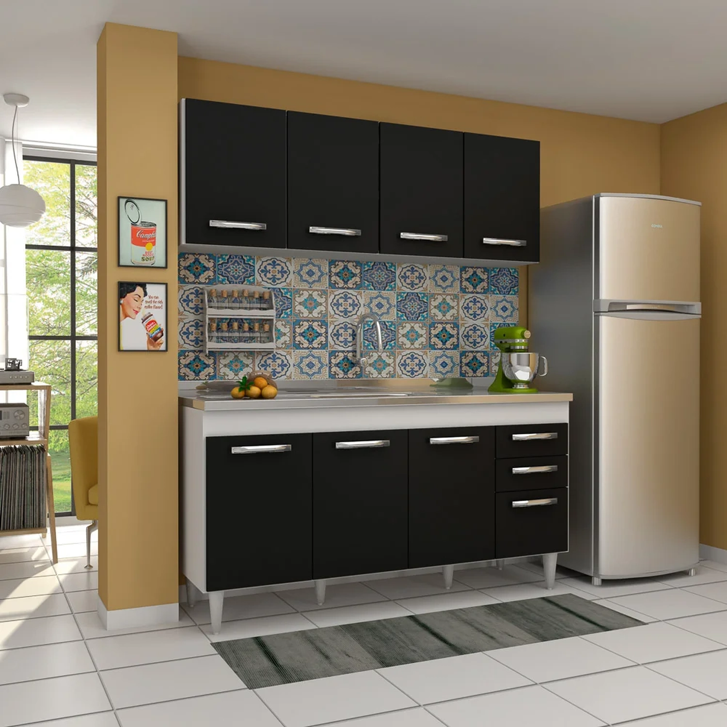 Características do Produto Material da Estrutura: MDP 15 mm. Material do Fundo: MDF 3 mm. Possui Tampo Para Pia: Não. Peso Suportado distribuído: Aéreo 40 Kg / Balcão 40 Kg. Tonalidade: Branco/Preto. Acabamento: Melamina BP/Fita. Escala de Brilho: Fosco. Quantidade de Portas: 8 Portas. Tipo de Porta: Convencional. Material da Porta: MDP. Quantidade de Gavetas: 2 Gavetas. Material das Gavetas: MDP. Tipo de Puxador: Plástico Cromado. Tipo de Corrediças: Metálicas. Possui Prateleiras: Sim. Material da Prateleira: MDP. Possui Pés: Sim, PVC. Altura dos pés: 17cm. Medida do Tampo/Pia Compatível: 160 cm. Diferenciais: - Design moderno. - Portas com dobradiças metálicas. - Amplo espaço interno. - Pés reguláveis. Sistema de Montagem: Minifix / Cavilhas / Parafusos. Manual de Montagem: Sim. Complexidade da Montagem: Baixa. Volumes: 2 Volumes. Montagem: Recomendamos que seja feita por um profissional. Recomendação de Limpeza: Utilize pano levemente úmido.