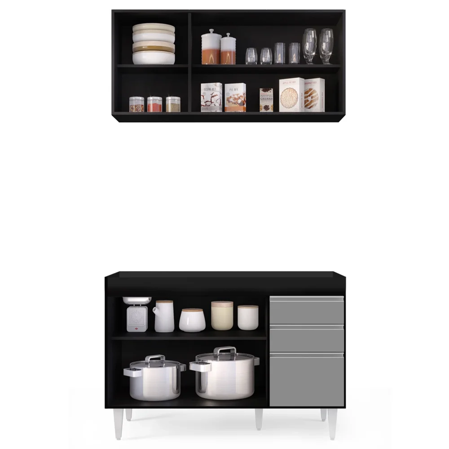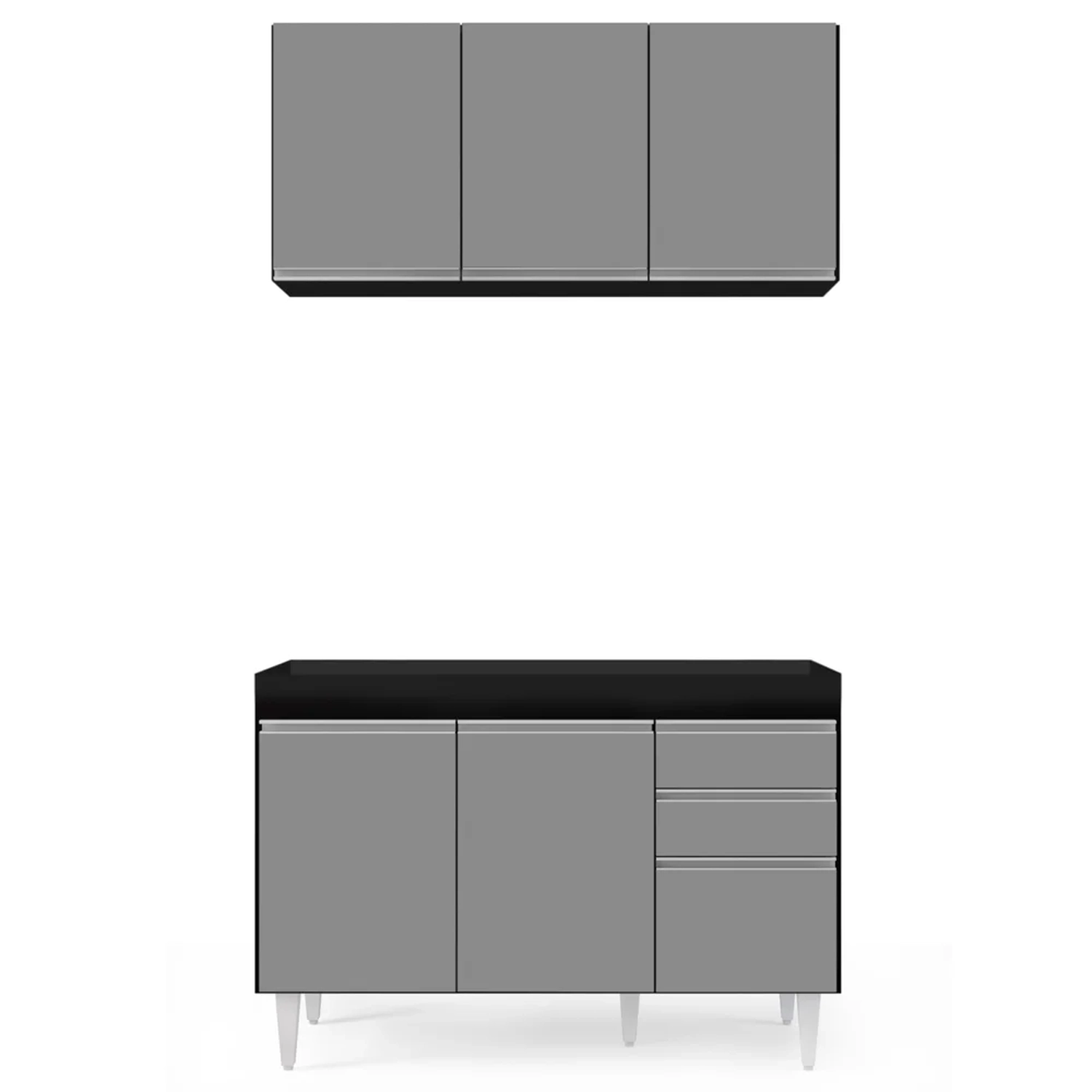 Por ser um cômodo onde praticidade e funcionalidade são conceitos que devem andar juntos, a cozinha muitas vezes é onde mais ficamos em dúvida sobre os complementos. Mas que tal investir em um kit com o essencial? Sim, a começar pelo Armário Virgínia que além das 3 portas com puxador em perfil metálico contém amplo espaço interno, já o balcão para pia Michigan Preto/Cinza é uma ótima alternativa por conter elementos indispensáveis nessa hora, que são as 3 portas com puxador em perfil metálico contendo amplo espaço interno e 2 gavetas para seus talheres! Tudo em MDP com acabamento em pintura BP e pés em PVC para sustentação do móvel!!