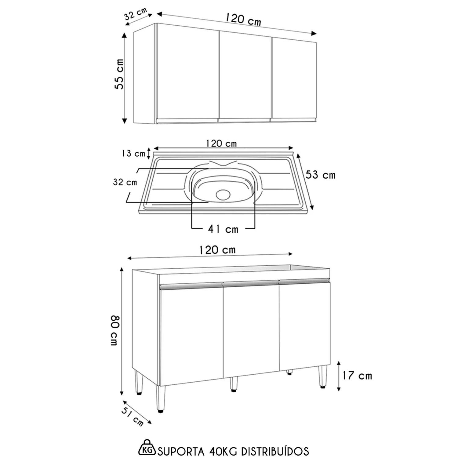 Peso Suportado: Balcão: 20 Kg distribuídos/ Armário: 20 Kg distribuídos