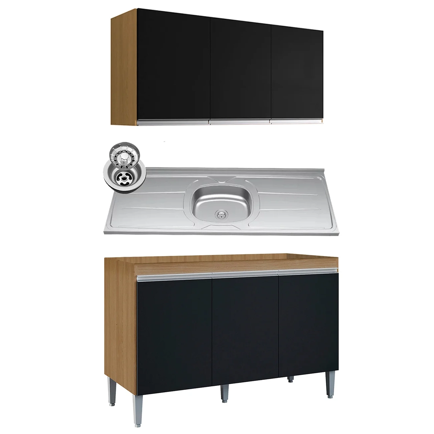 Conteúdo da Embalagem: 1 Armário aéreo, 1 Balcão, 1 Pia.