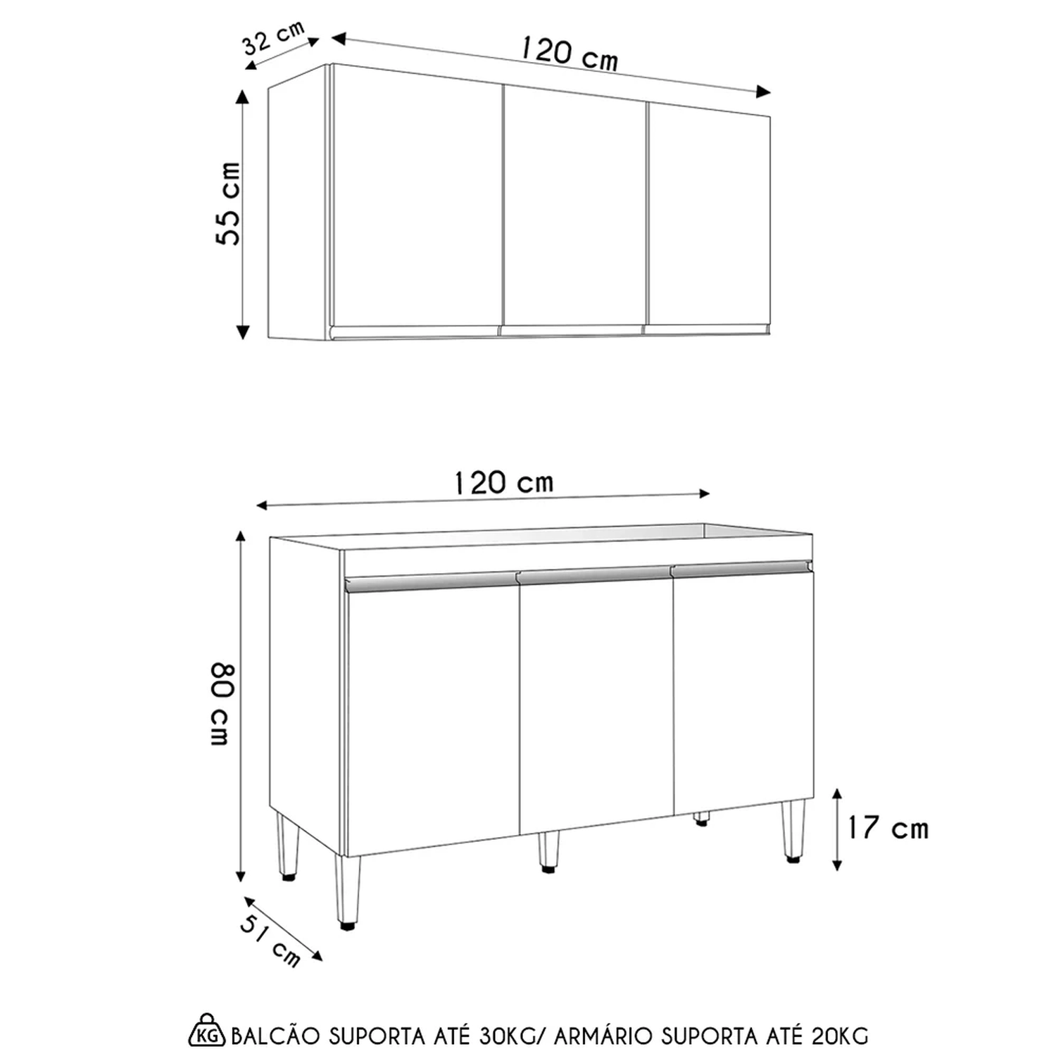Peso Suportado: Balcão: 20 Kg distribuídos/ Armário: 20 Kg distribuídos.