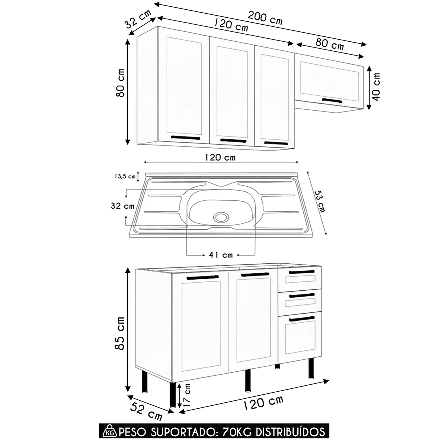 Peso Suportado Distribuído: Armário Aéreo 80cm: 7 Kg/ Balcão: 28 Kg/ Pia Inox: 15 Kg.