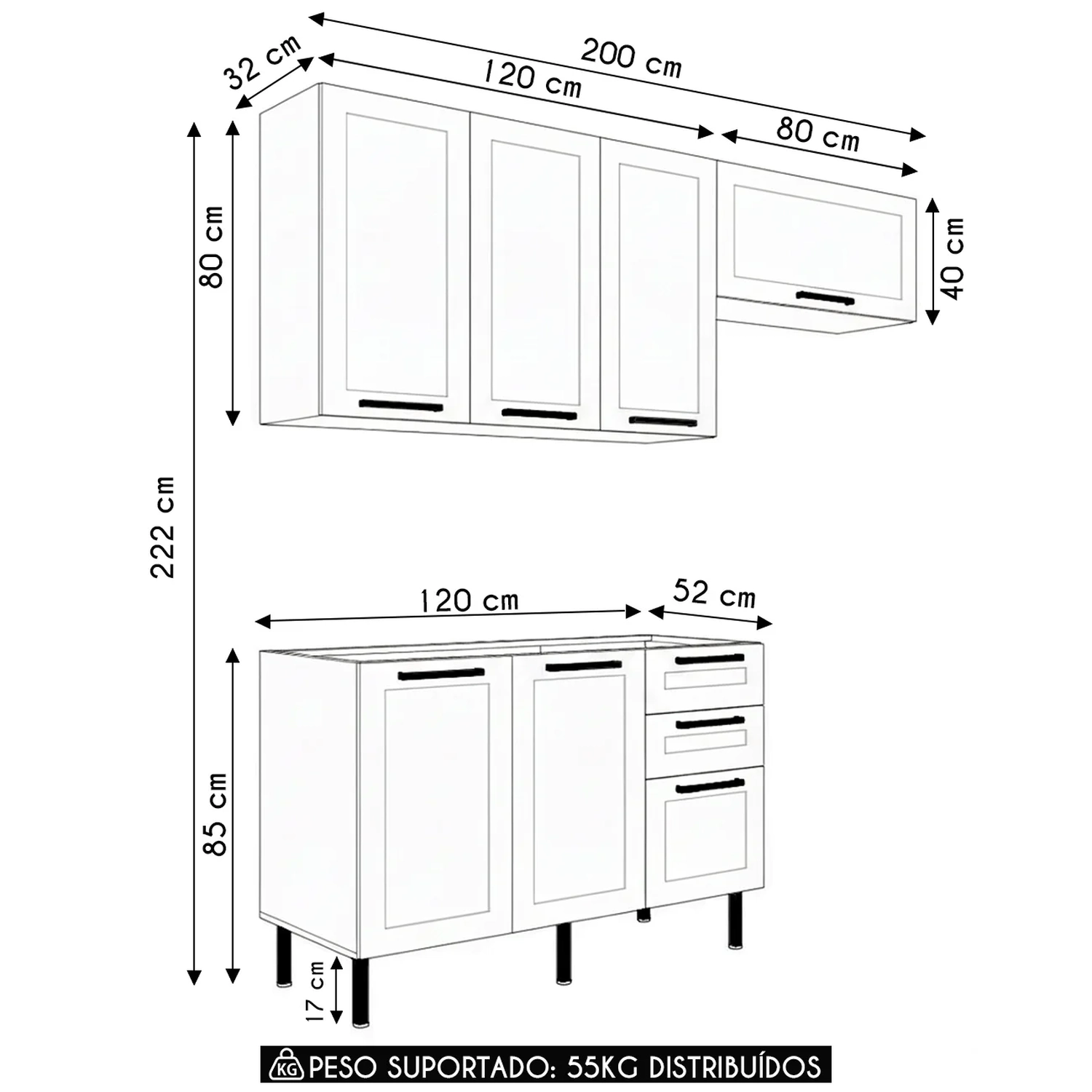 Conteúdo da Embalagem: 1 Armário Aéreo 120cm, 1 Armário Aéreo 80cm, 1 Balcão 120cm.