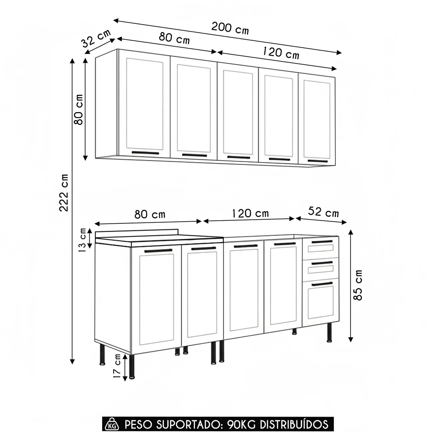 Peso Suportado Distribuído: Armário 80cm: 10 Kg/ Armário 120cm: 20 Kg/ Balcão 80cm: 12 Kg/ Balcão 120cm: 28 Kg/ Tampo 80cm: 20 Kg.