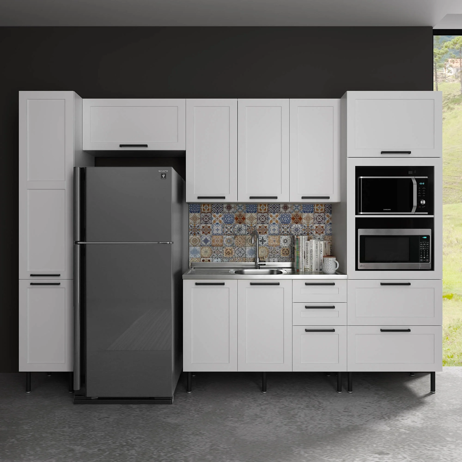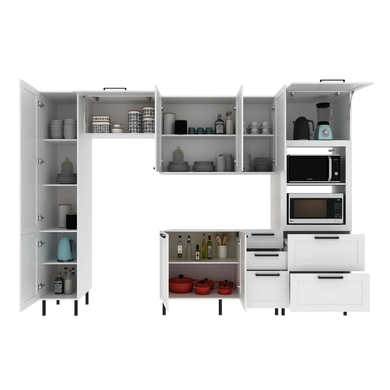 O conjunto conta com um Paneleiro com portas, prateleiras internas e gavetões, além de espaços para eletrodomésticos. Inclui também Armários Aéreos, sendo um com porta basculante e outro com portas convencionais, além de um Balcão Com Tampo com portas e gavetas.