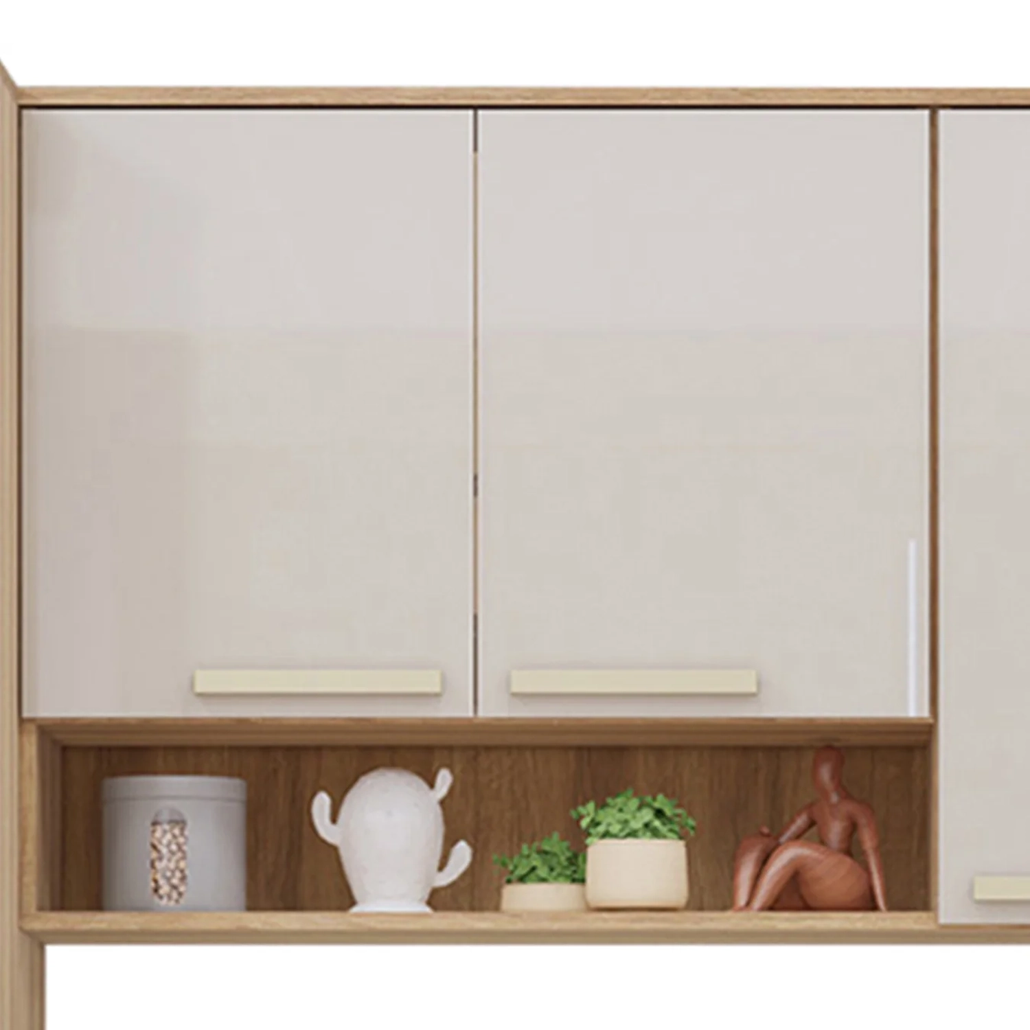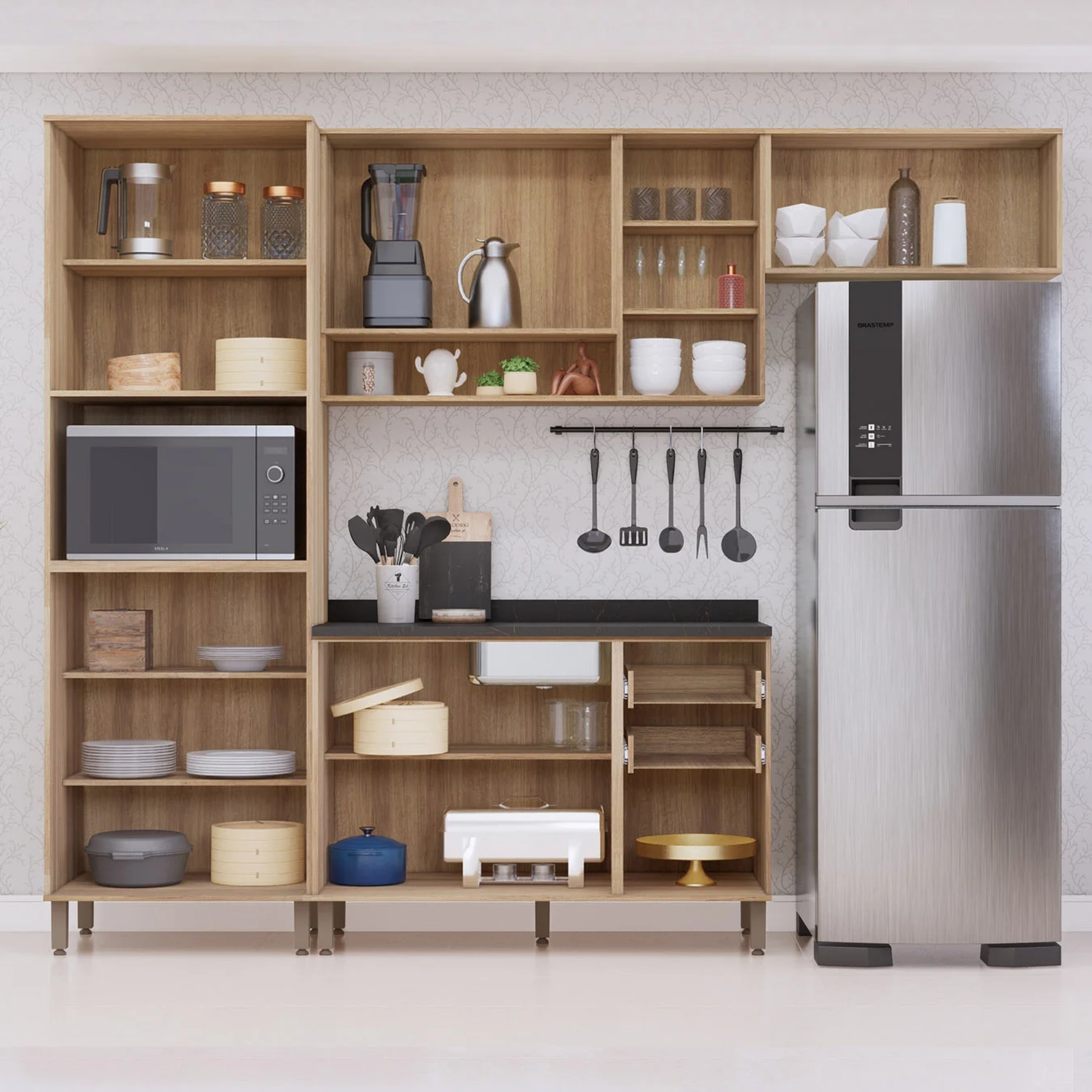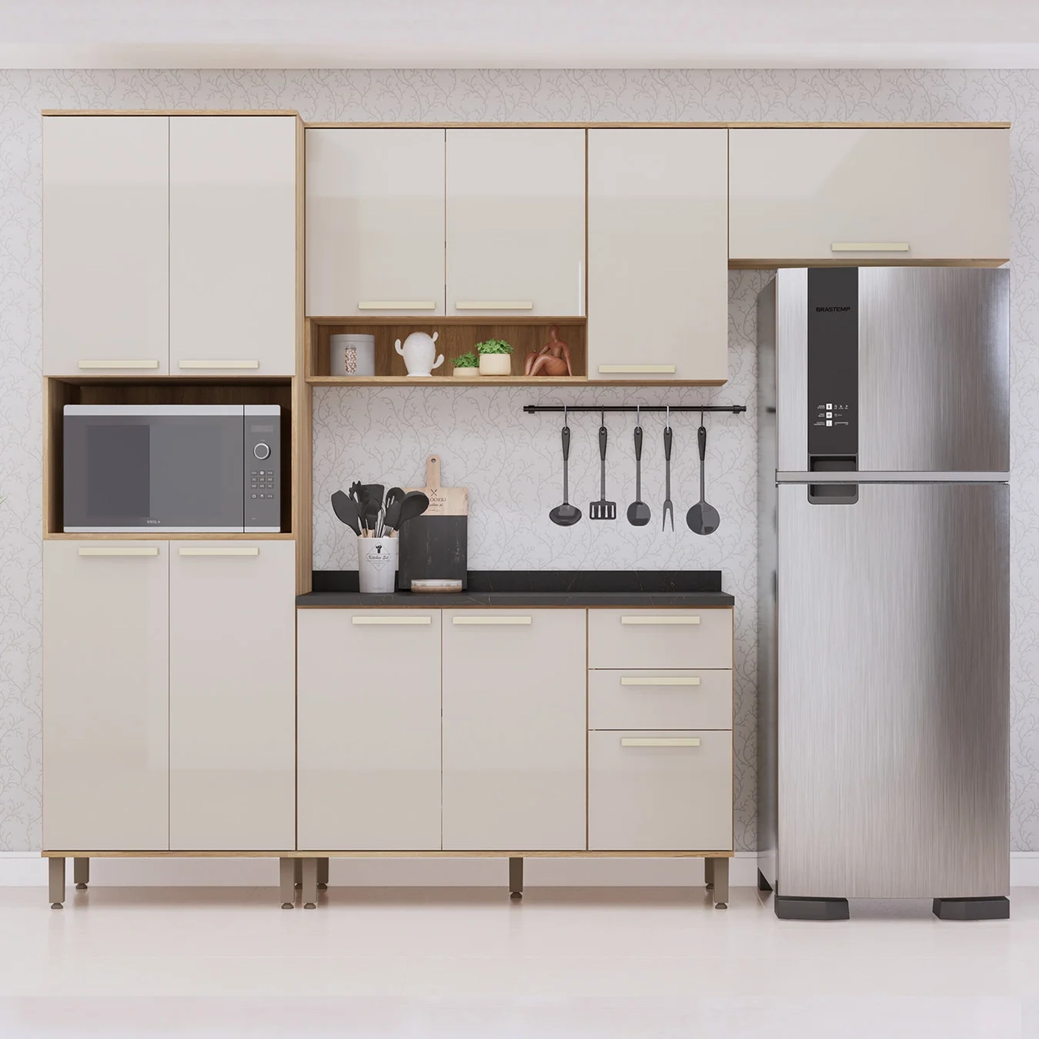 O conjunto inclui dois Armários Aéreos, um com nicho e portas dobradiças metálicas com amortecimento, e outro com porta basculante com pistão a gás, proporcionando facilidade na abertura. Esses elementos tornam a Cozinha mais eficiente e estilosa.