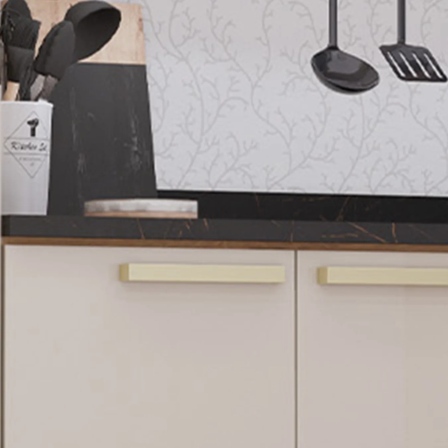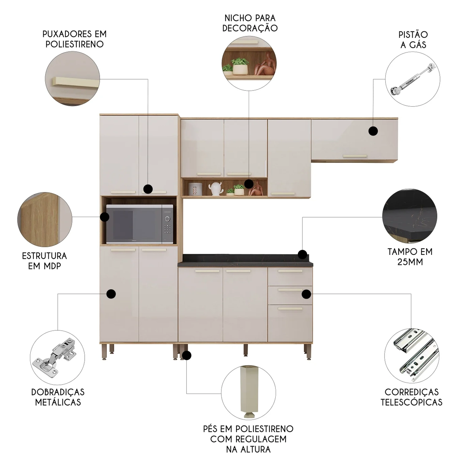 Tanto o balcão quanto o paneleiro possuem pés com regulagem de altura, assegurando maior estabilidade em qualquer tipo de piso. Os puxadores em poliestireno conferem um toque de sofisticação e longa durabilidade aos móveis.