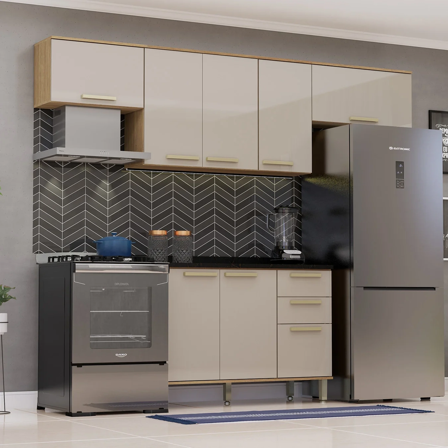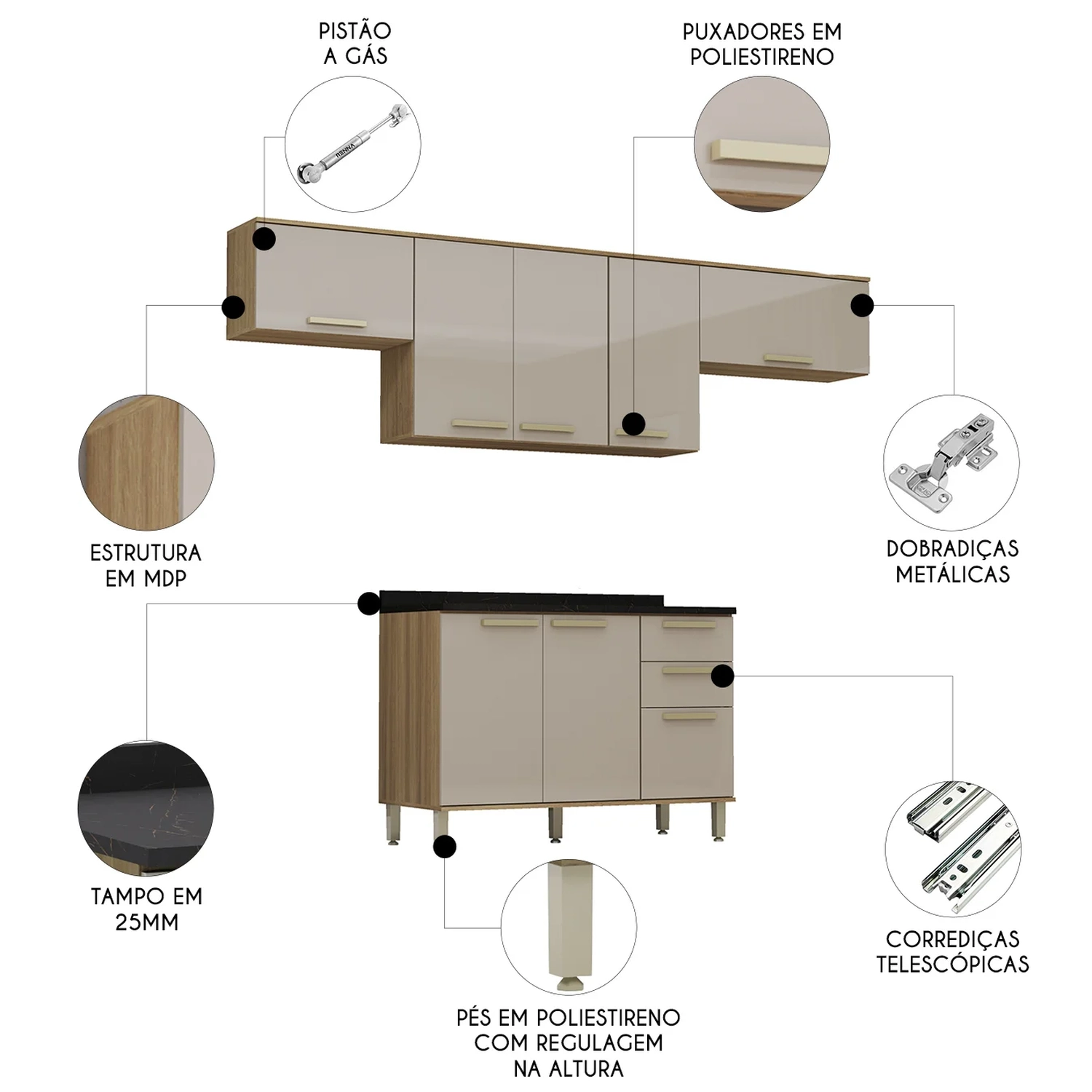 O balcão conta com pés com regulagem de altura, garantindo estabilidade e adaptação a diferentes tipos de piso. Os puxadores em poliestireno adicionam durabilidade e um toque sofisticado aos móveis. Uma solução funcional para tornar sua cozinha mais organizada e versátil.