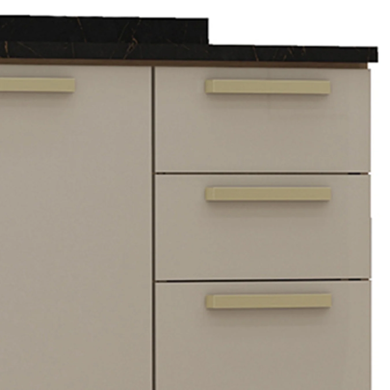 O Balcão Gabinete possui três portas, gavetas com corrediças telescópicas e prateleira interna, ideal para armazenar utensílios com praticidade. Acompanha tampo em MDP de 25mm, resistente e fácil de limpar, perfeito para as tarefas diárias na Cozinha.