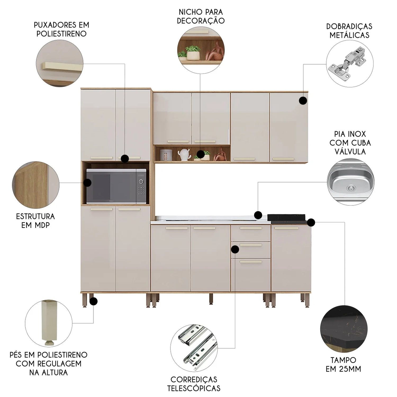 Conteúdo da Embalagem: 1 Paneleiro, 1 Aéreo 120cm, 1 Aéreo 40cm, 1 Balcão 40cm, 1 Balcão 120cm, 1 Pia Inox.