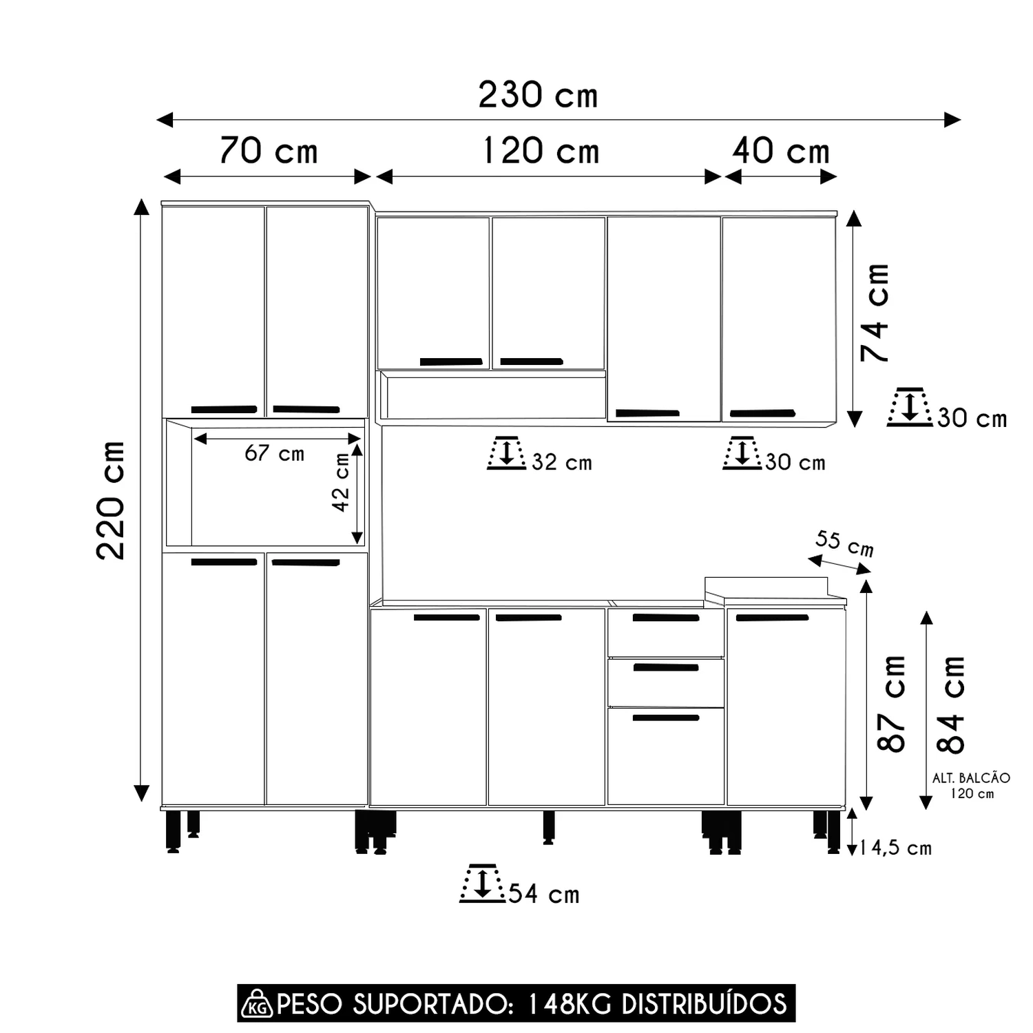 Peso Suportado Distribuído: Paneleiro 45 kg/ Aéreos 28kg/ Balcões 60kg/ Pia 15kg.