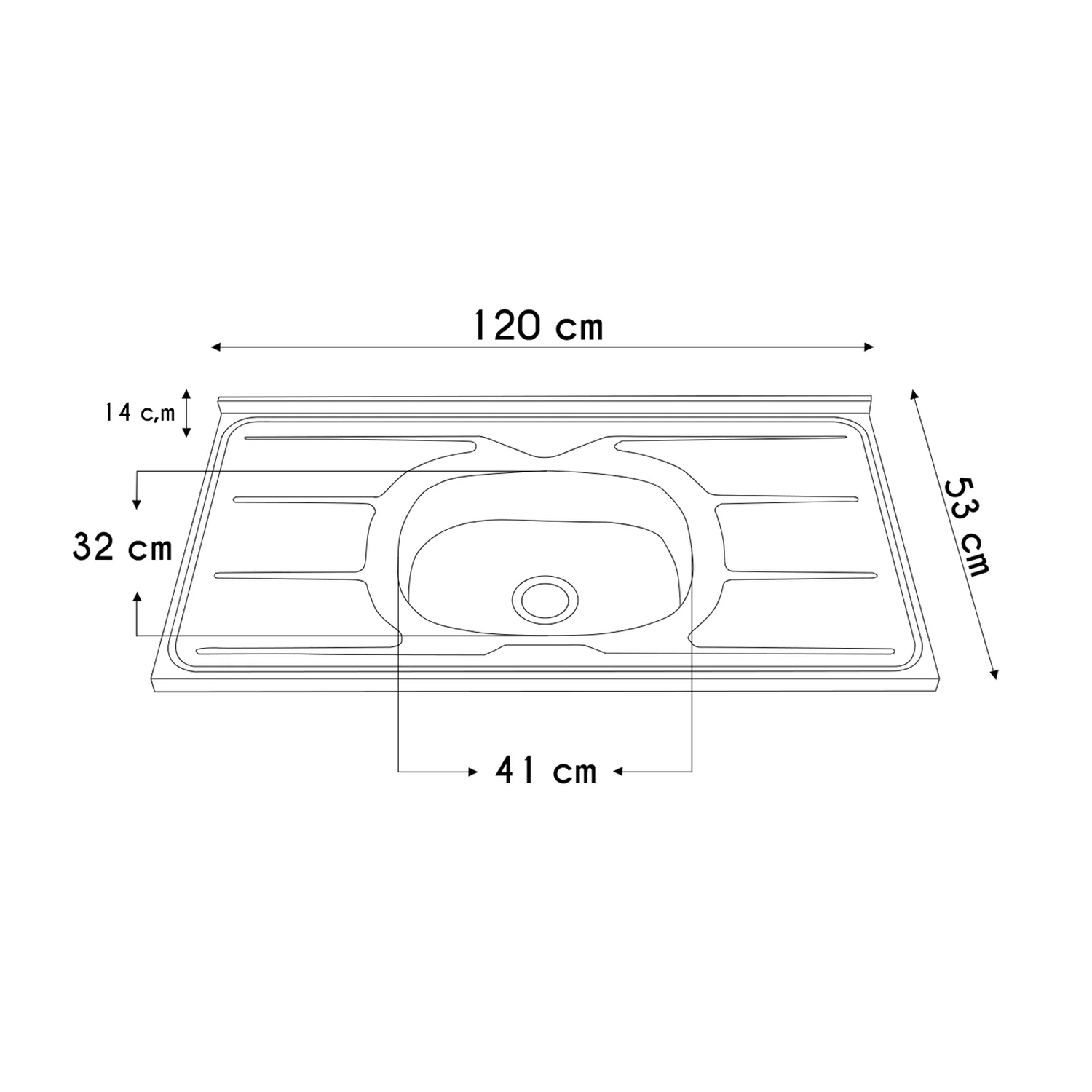 Pia Inox: 120 cm x 14 cm x 53 cm.