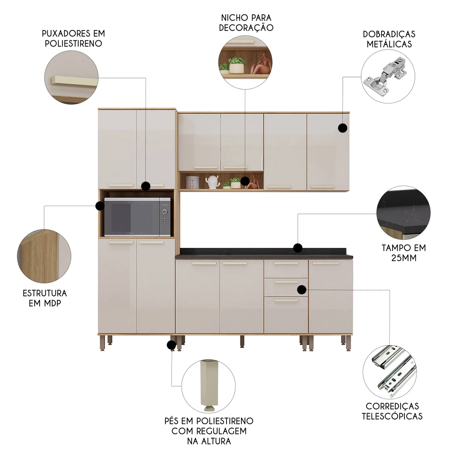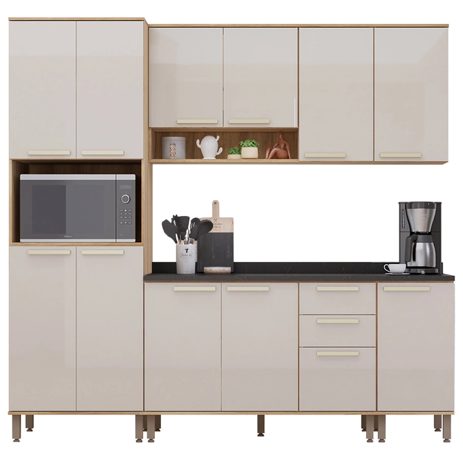 O Armário de Cozinha é perfeito para organizar o ambiente e facilitar as tarefas diárias. Produzido em MDP, oferece durabilidade para o uso constante. O Paneleiro Com Nicho para micro-ondas, portas com amortecimento e prateleiras internas que auxiliam na organização dos itens essenciais.
