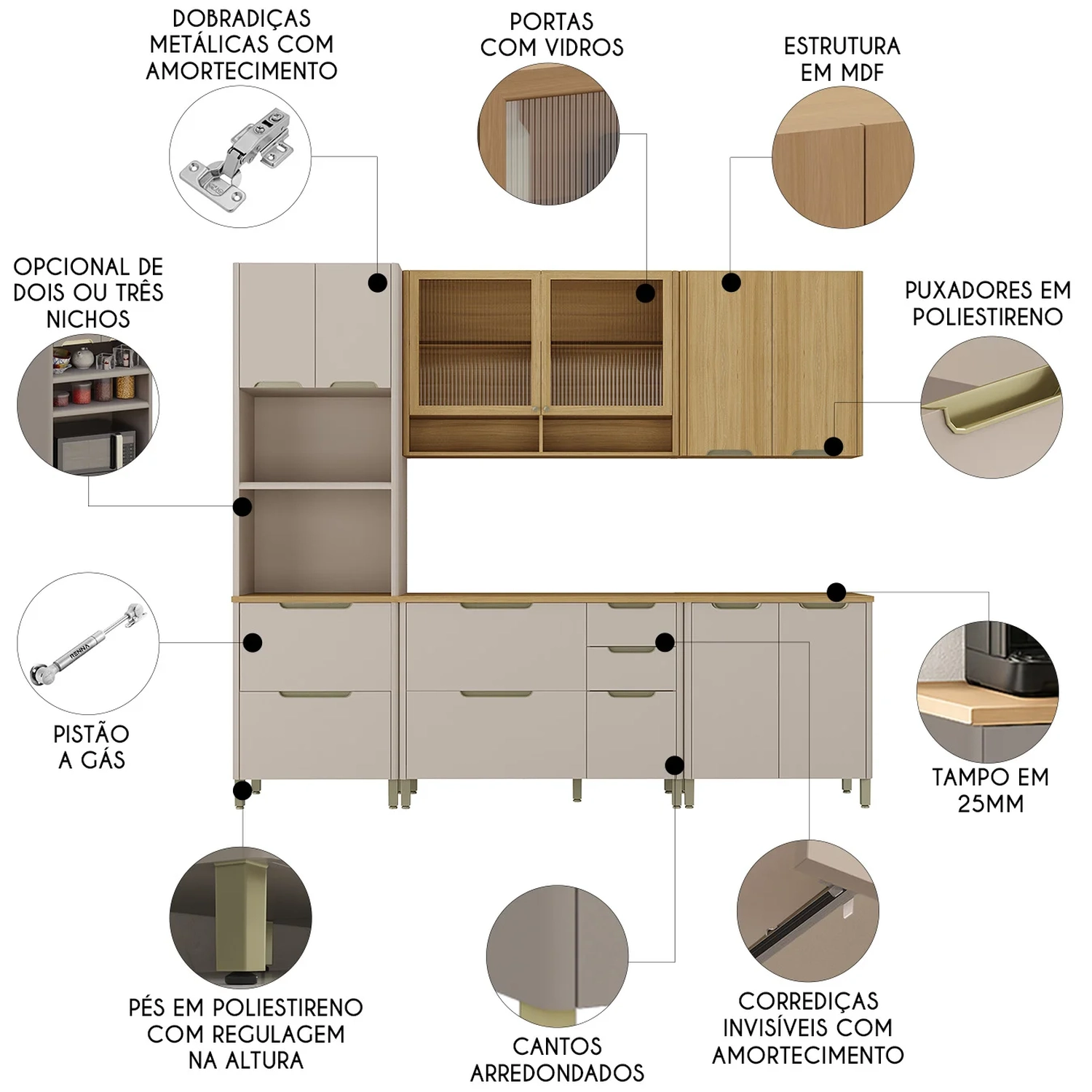 Todos os móveis contam com puxadores em poliestireno em formato meia-lua. Os pés com regulagem de altura oferecem estabilidade em qualquer piso. Um conjunto completo, moderno e funcional para transformar sua cozinha com estilo.